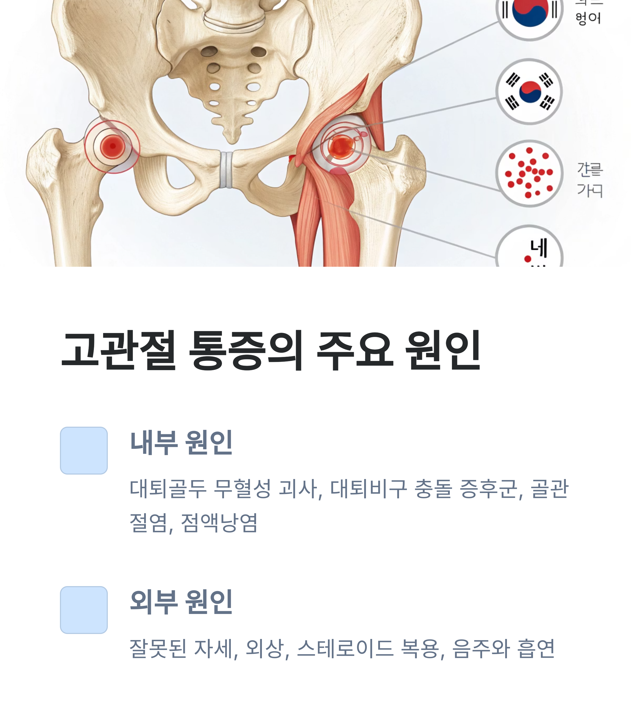 고관절 통증은 내부적 원인과 외부적 요인으로 나뉩니다.