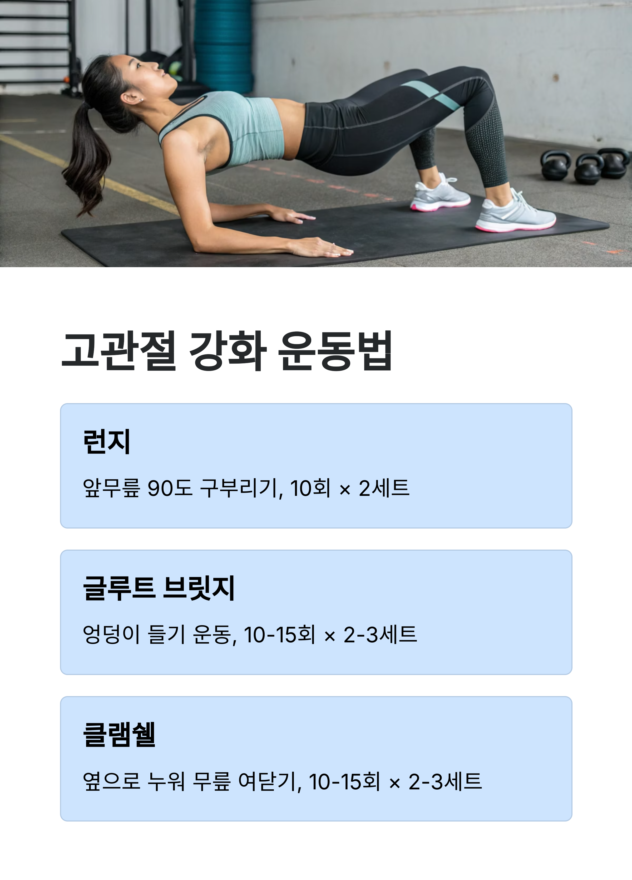 | 클램쉘 | 옆으로 누워 무릎을 여닫아 엉덩이 근육 단련 | 10~15회 × 2~3세트 |