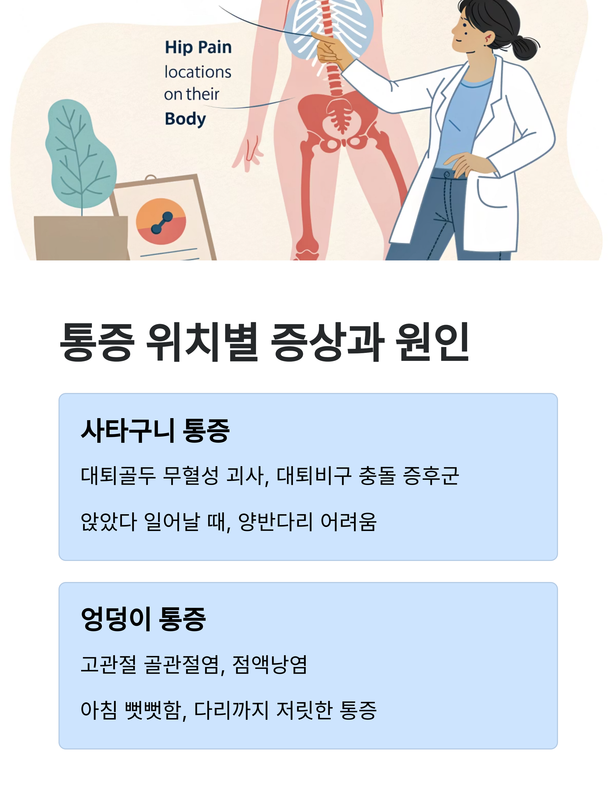 병원에 가자니 큰 병인가 싶고, 그냥 참고 있자니 일상생활이 너무 불편해서 결국 고관절 통증에 대해 제대로 공부해보기로 했습니다.
