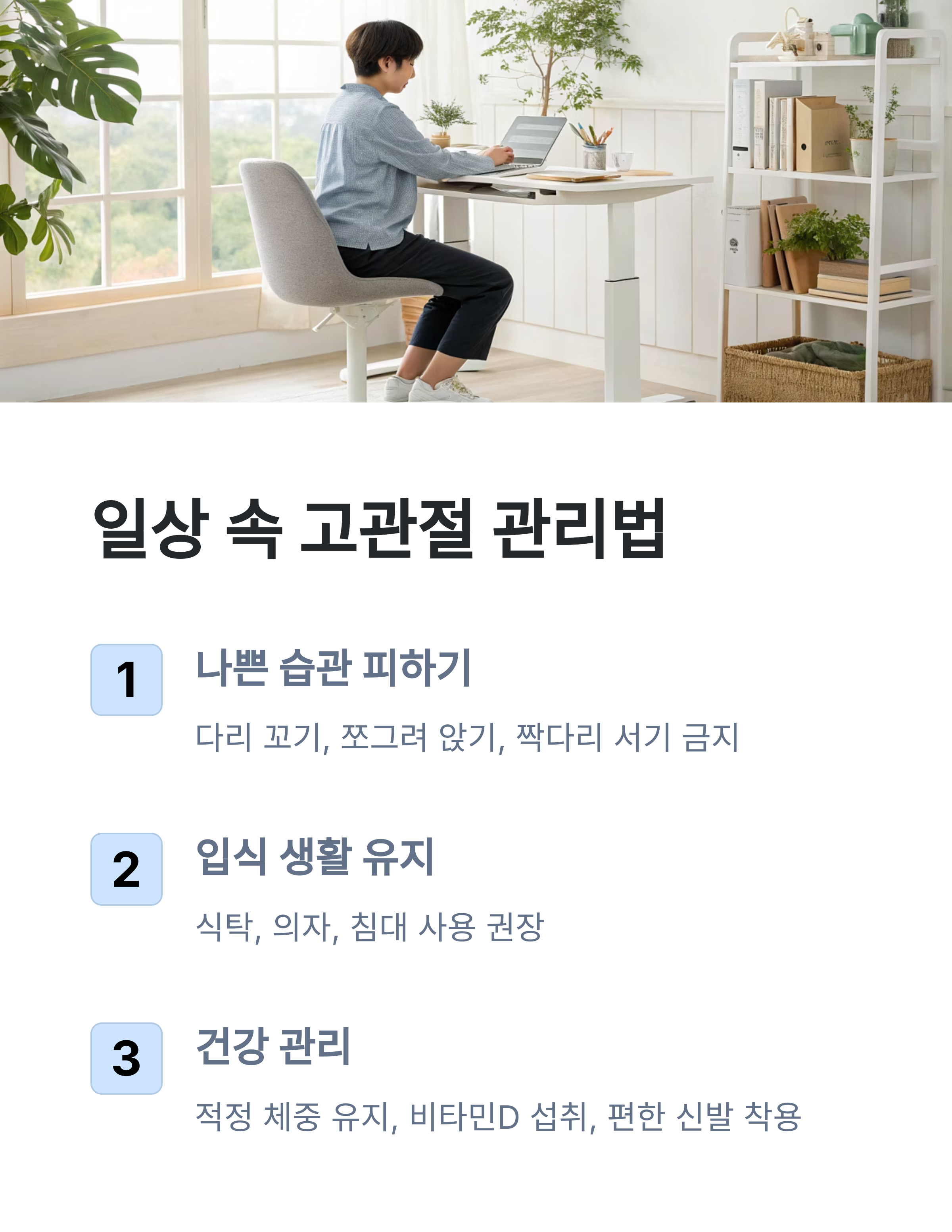 아래의 생활 팁을 참고해 일상 속에서 고관절을 지키는 습관을 만들어보세요.