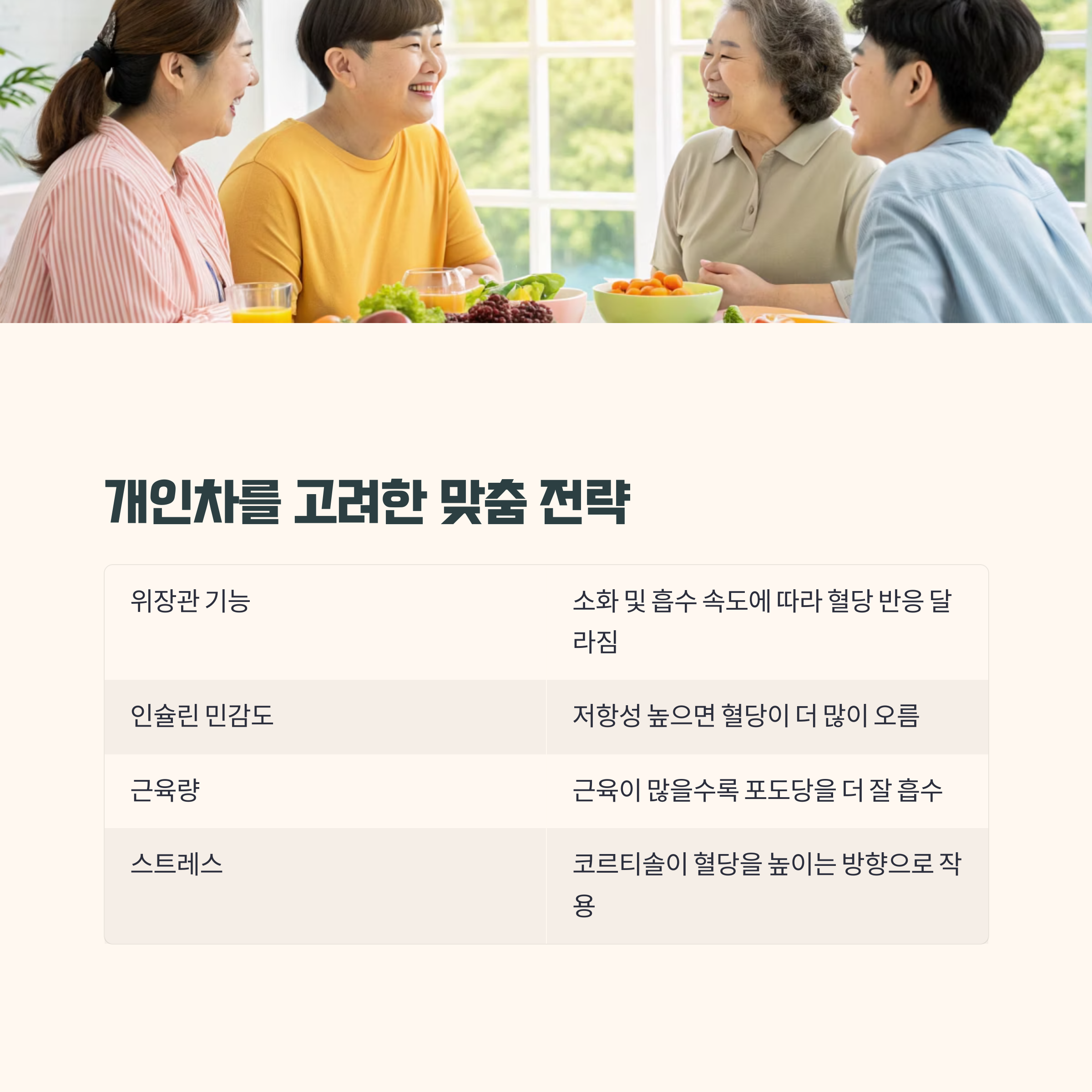 | 인슐린 민감도 | 같은 음식이라도 인슐린 저항성이 높으면 혈당이 더 많이 오름 |