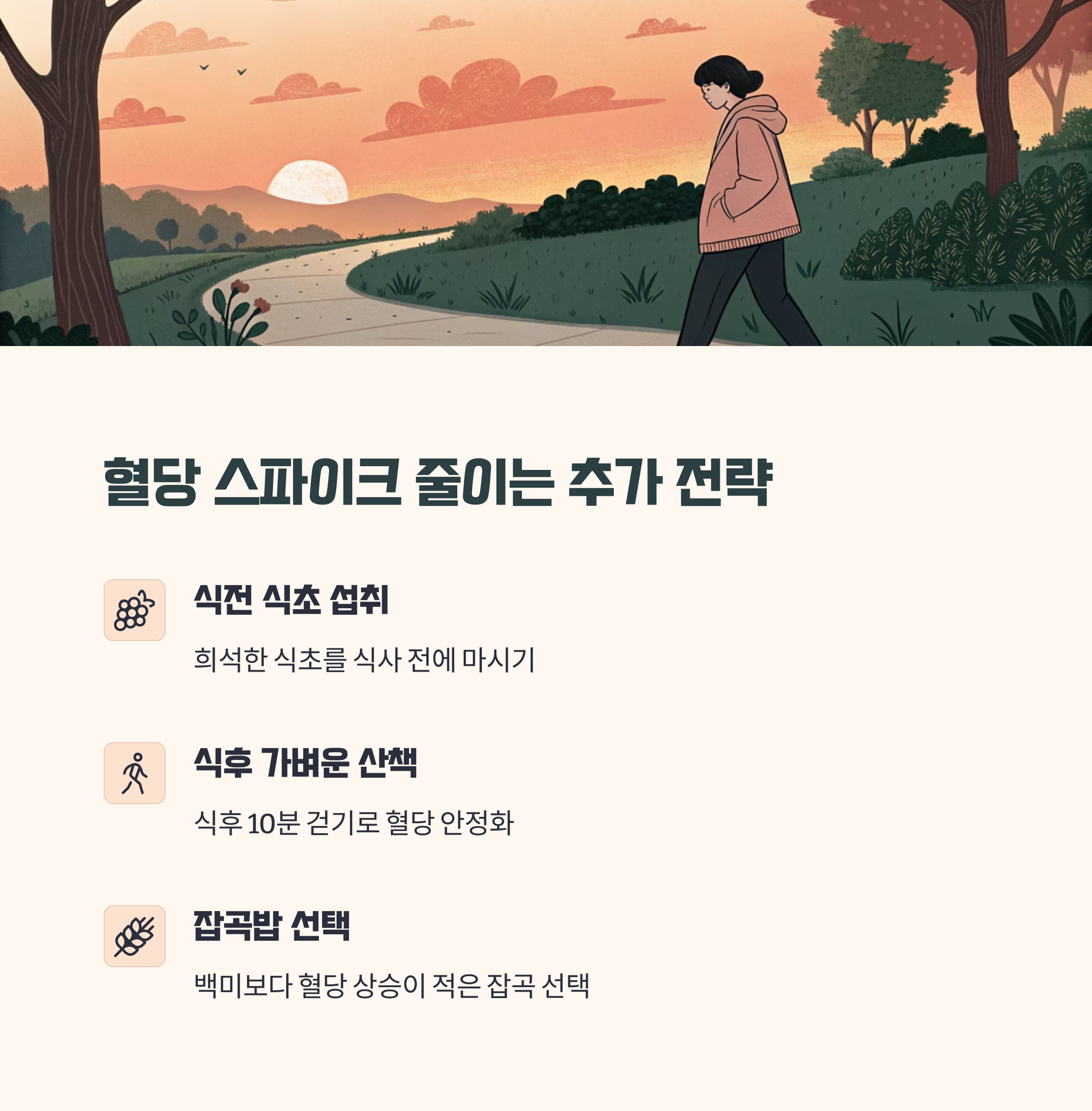 예를 들어 식전에 식초를 희석해 마시거나 식후에 가볍게 걷는 것만으로도 혈당 조절에 유의미한 영향을 줄 수 있어요.