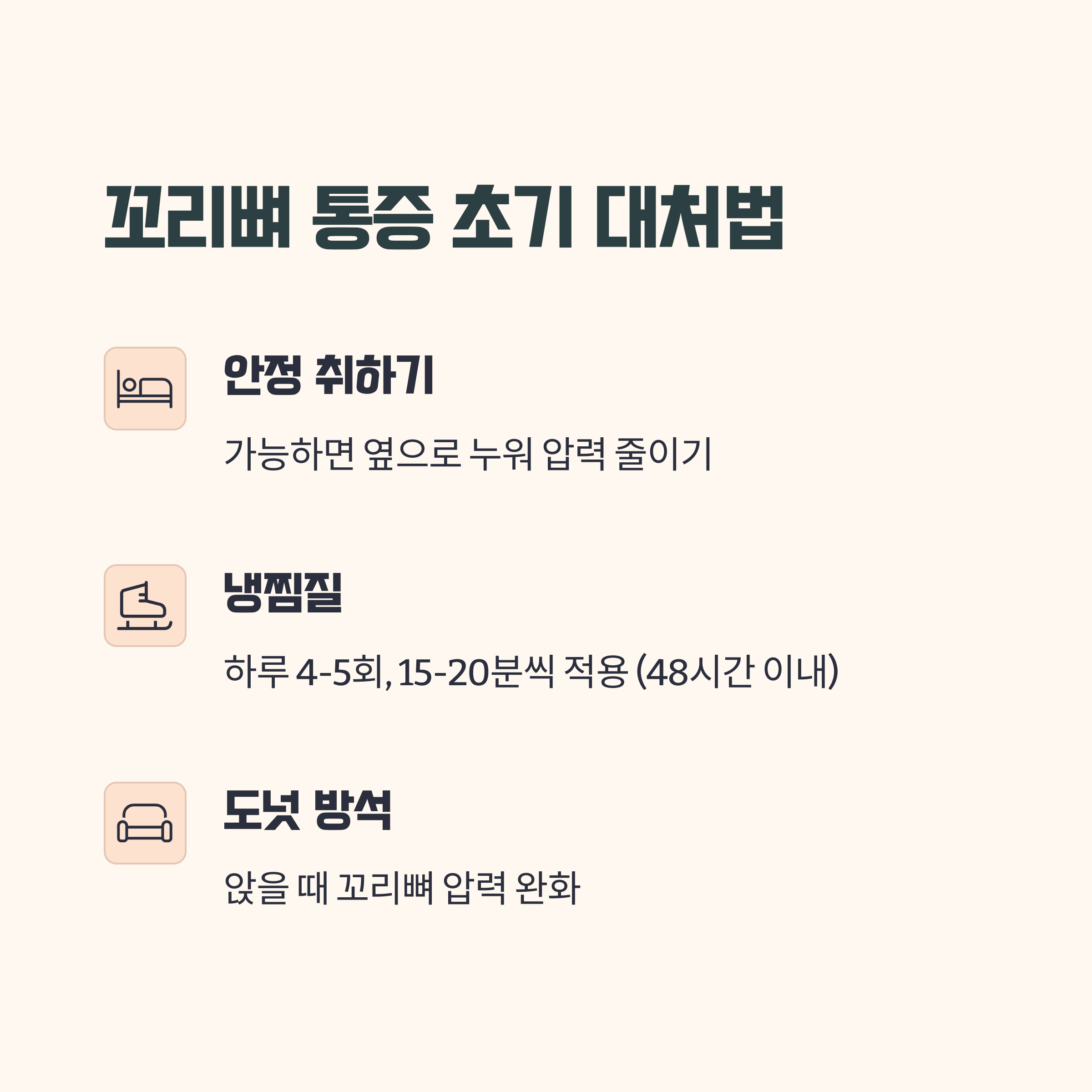 특히 넘어지거나 바닥에 세게 부딪힌 후라면 최대한 빨리 누워서 꼬리뼈에 가해지는 압력을 줄여주는 것이 좋아요.