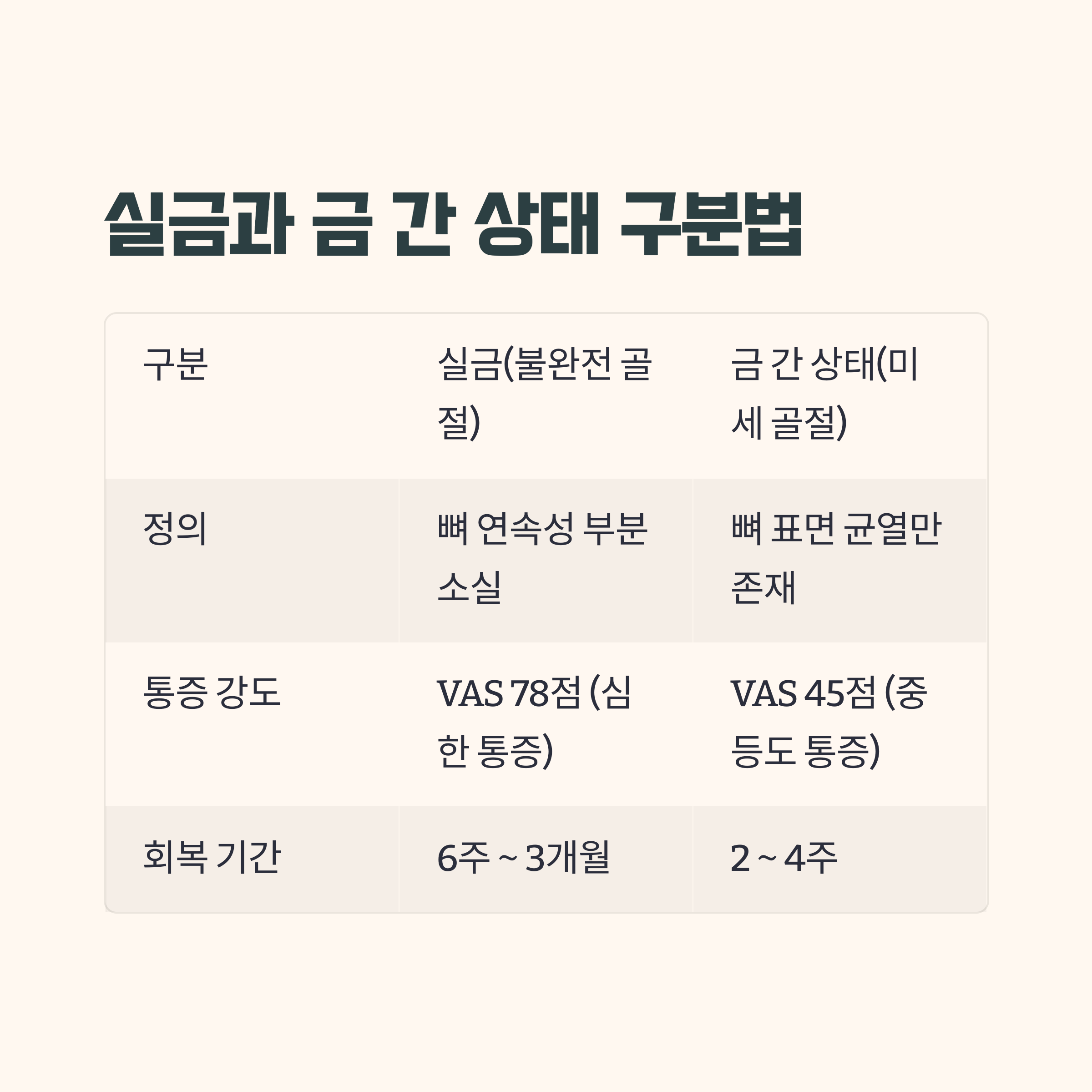 | 구분 | 실금(불완전 골절) | 금 간 상태(미세 골절) |