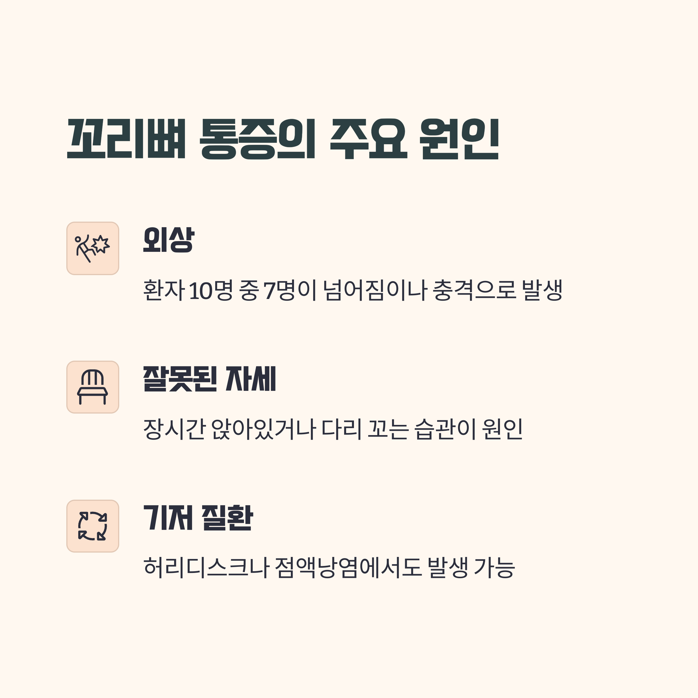 꼬리뼈 통증의 원인은 의외로 다양해요. 단순히 넘어지거나 부딪힌 충격뿐 아니라, 잘못된 자세, 심지어 허리디스크나 점액낭염 같은 다른 질환에서도 나타날 수 있답니다.