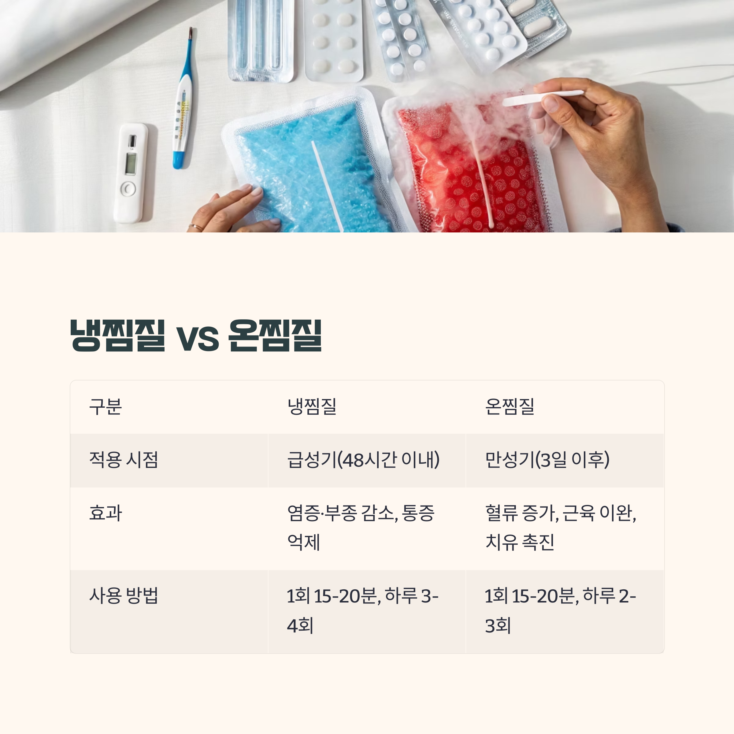 - 냉찜질: 하루 4~5회, 15~20분 적용 (48시간 이내 가장 효과적)