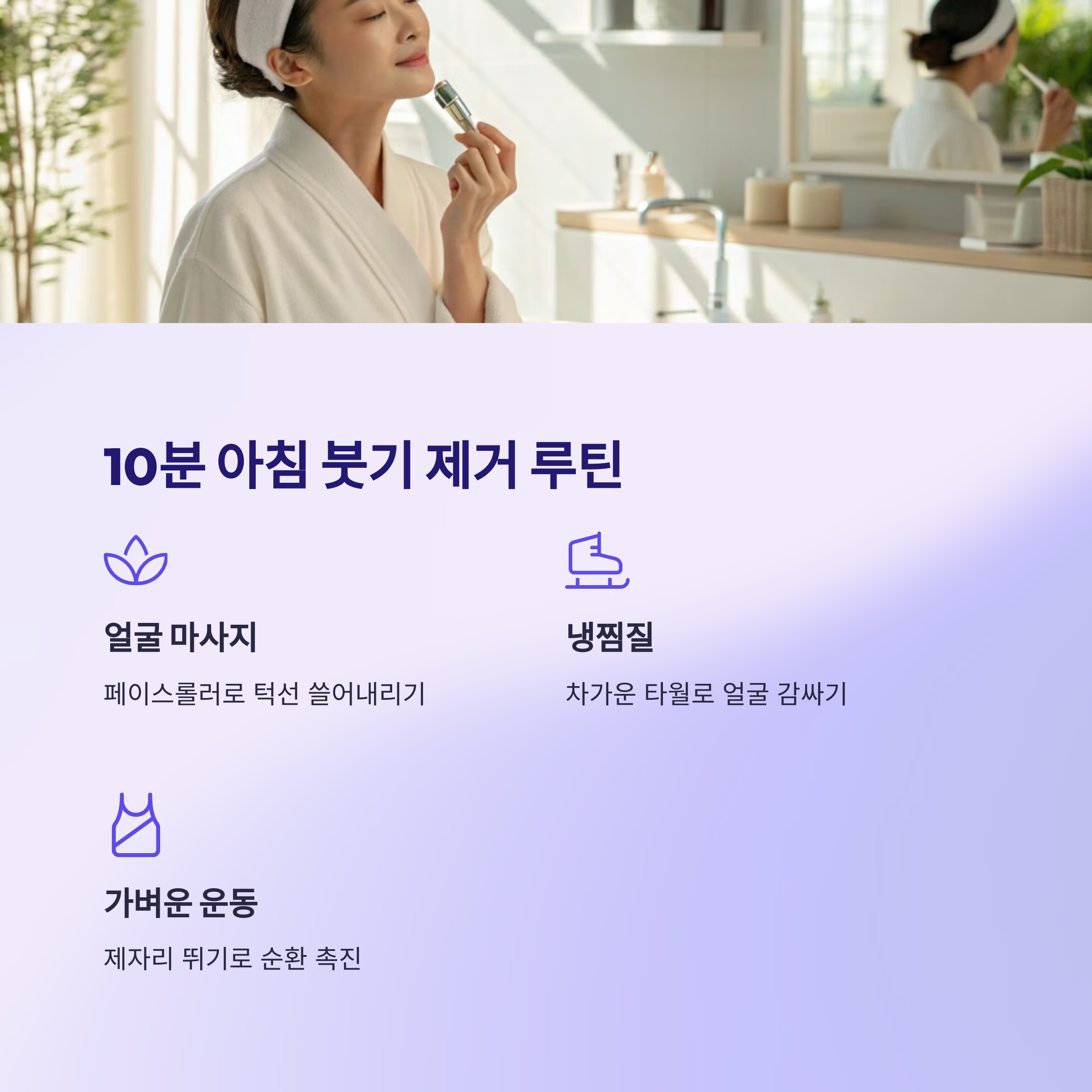 차가운 페이스롤러나 냉찜질, 그리고 짧은 유산소 운동이 가장 빠르게 붓기를 줄여줍니다.