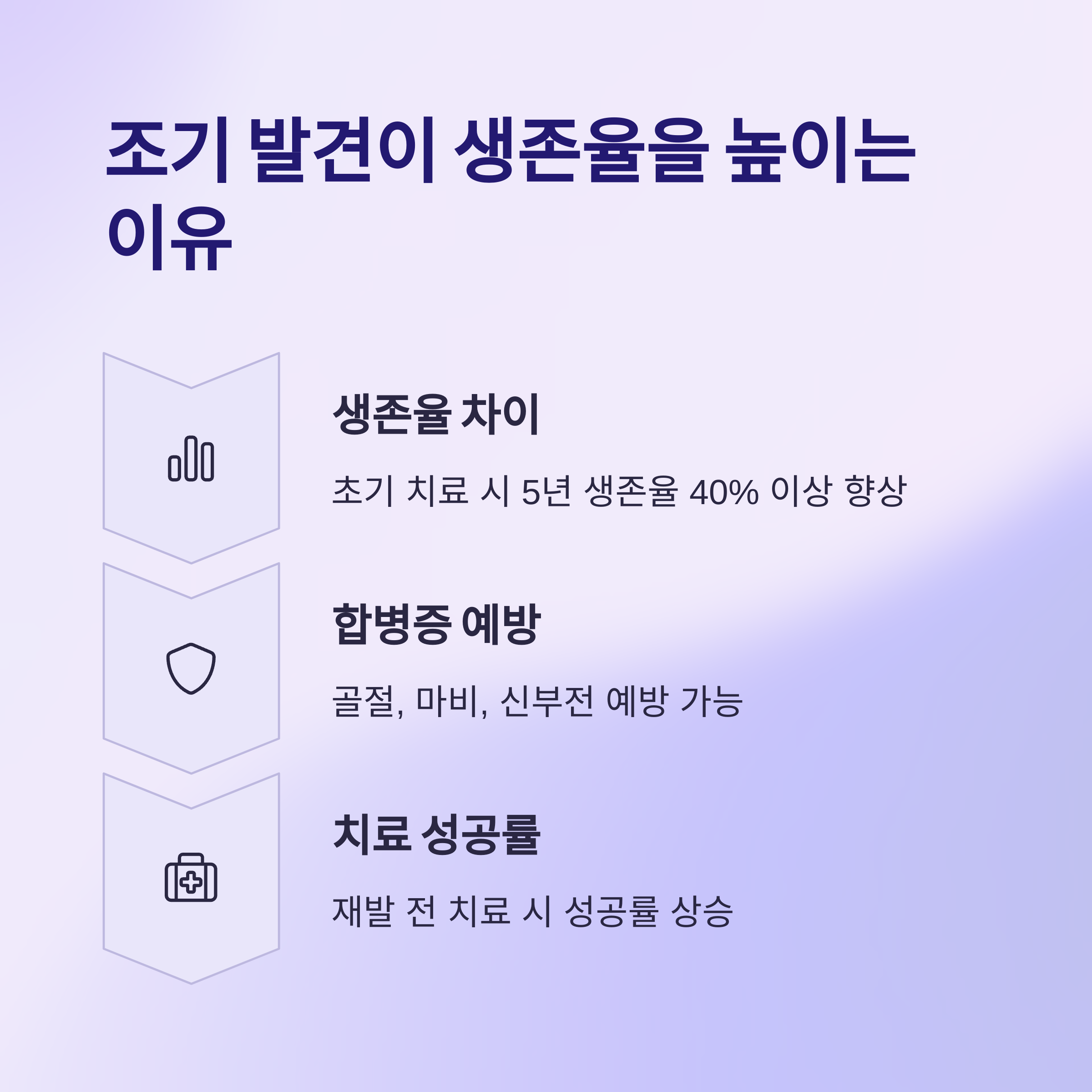 - 5년 생존율이 초기 치료 여부에 따라 20%에서 40% 이상까지 차이 발생