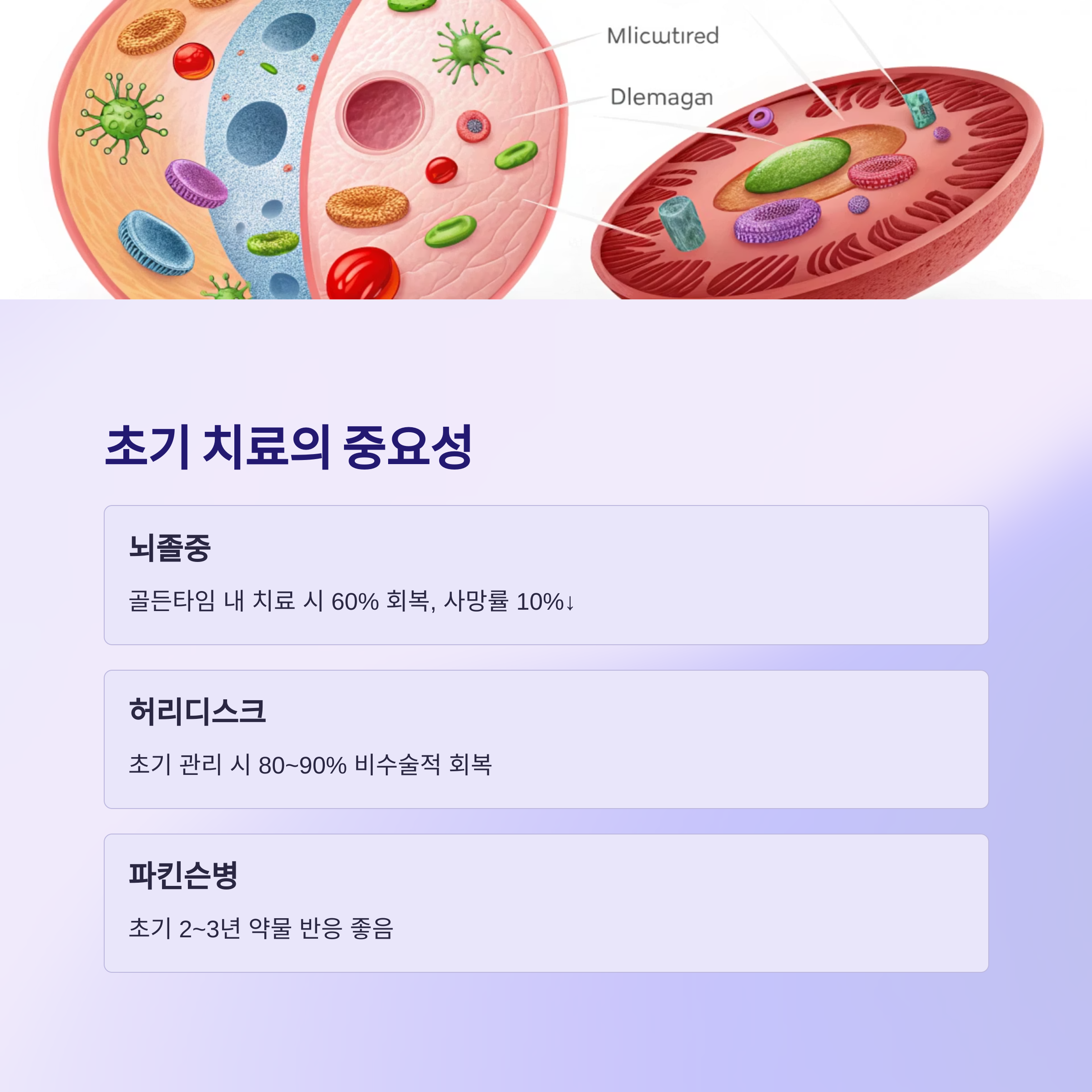 - 뇌졸중: 골든타임 내 치료 시 3개월 내 60% 회복, 사망률 10%↓