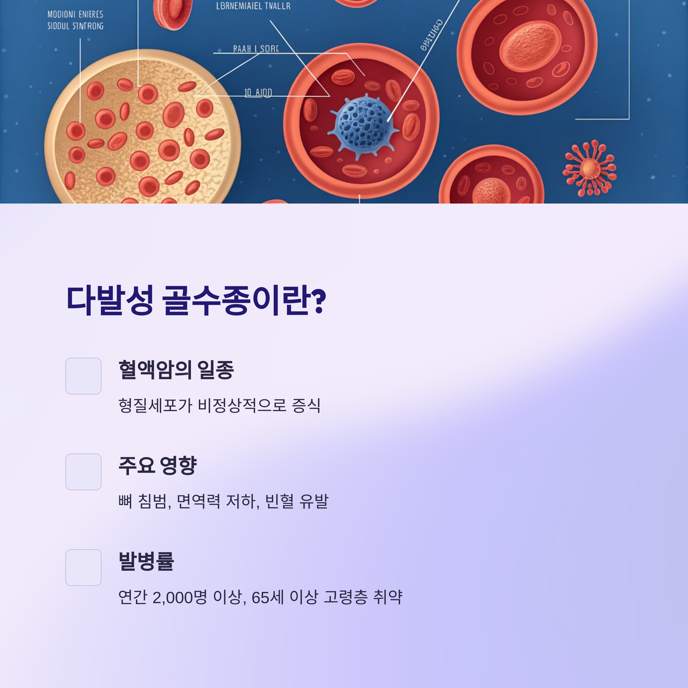 다발성 골수종은 혈액암의 일종으로, 면역 체계에서 항체를 생성하는 형질세포가 비정상적으로 증식하면서 발생합니다.