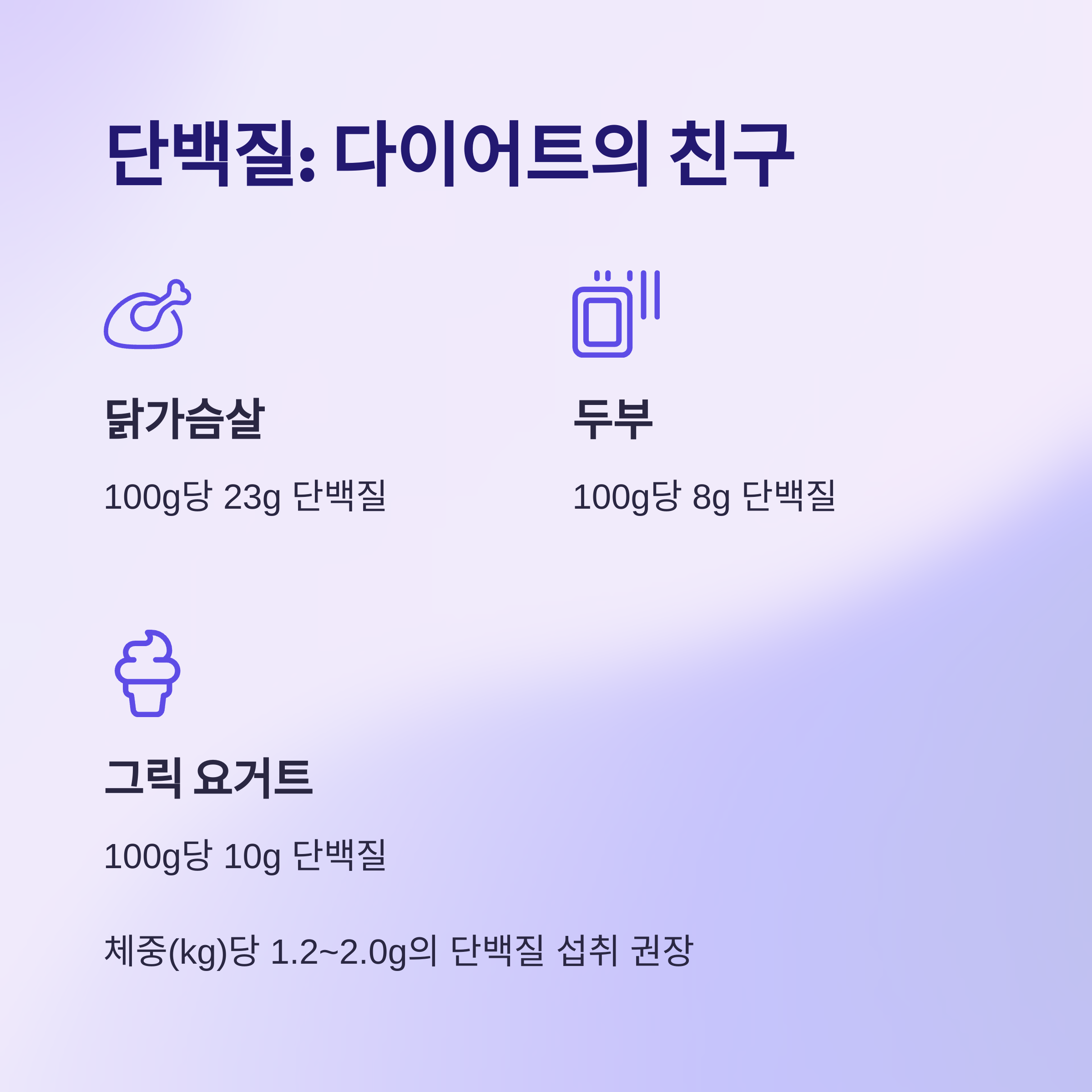 단백질은 다이어트의 핵심 영양소예요. 근육 손실을 방지하고, 포만감을 오래 지속시켜 과식을 막아줘요. 체중(kg)당 1.2~2.0g의 단백질을 섭취하는 것이 좋습니다.