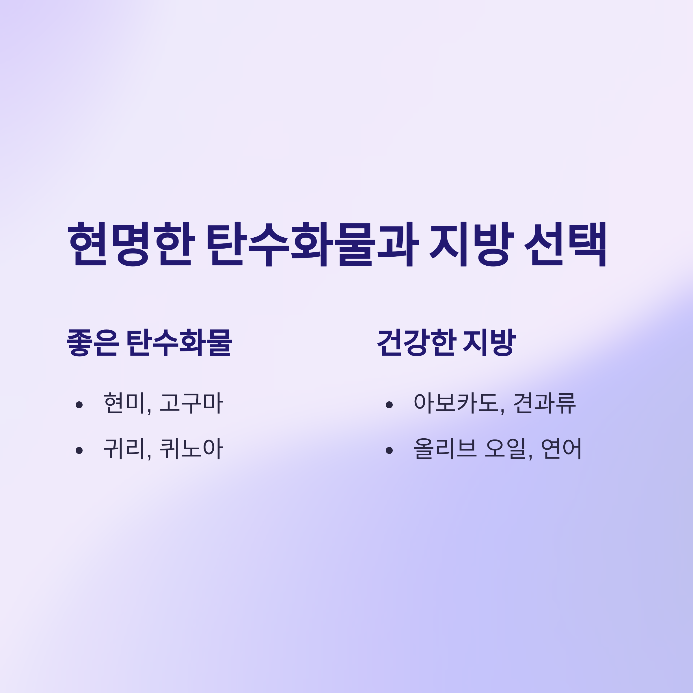 - 좋은 탄수화물: 현미, 고구마, 귀리, 퀴노아