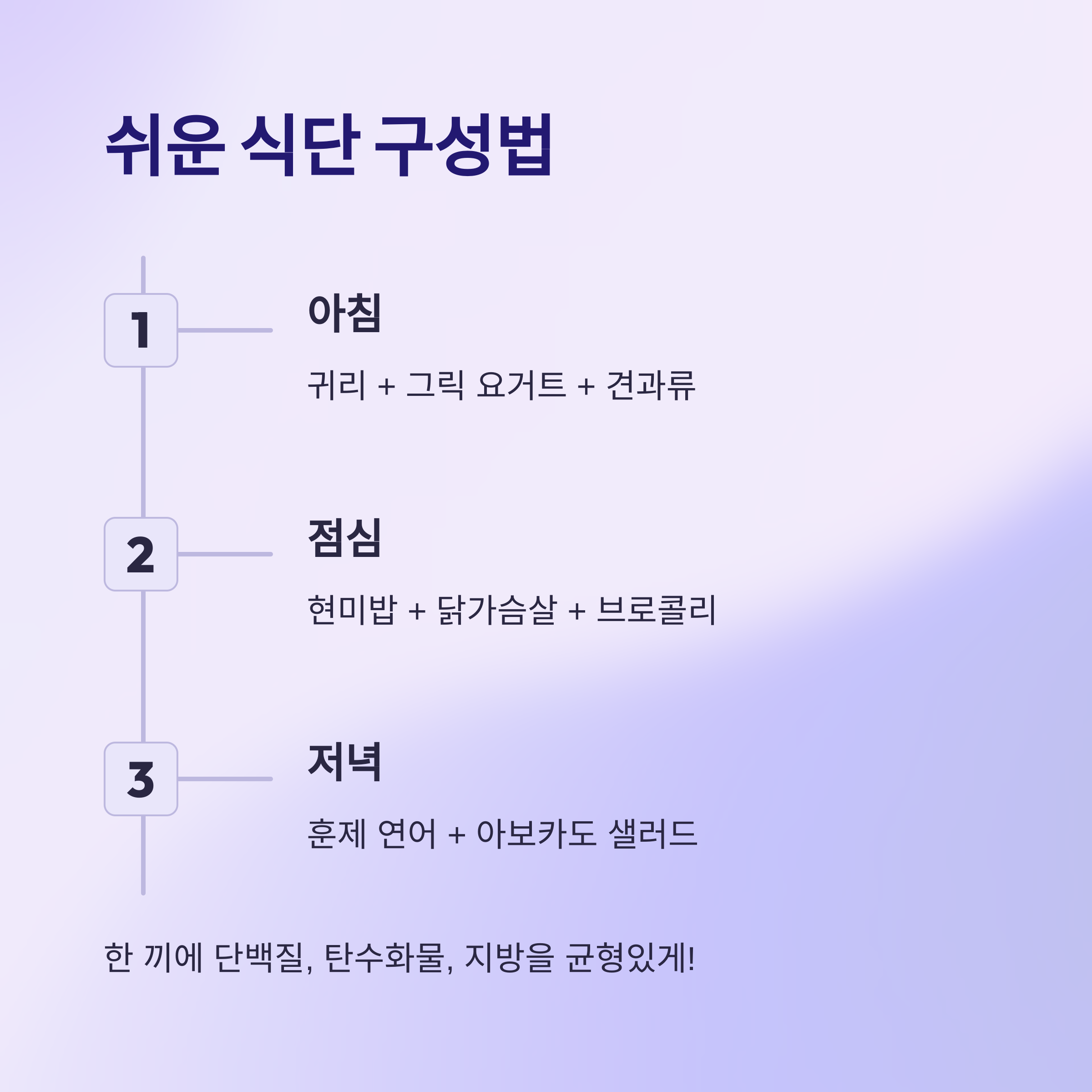 다이어트 식단을 어렵게 생각할 필요 없어요! 기본 원칙만 지키면 누구나 쉽게 식단을 구성할 수 있습니다. 가장 쉬운 방법은 한 끼 식사에 단백질, 탄수화물, 지방을 균형 있게 포함하는 것이에요.