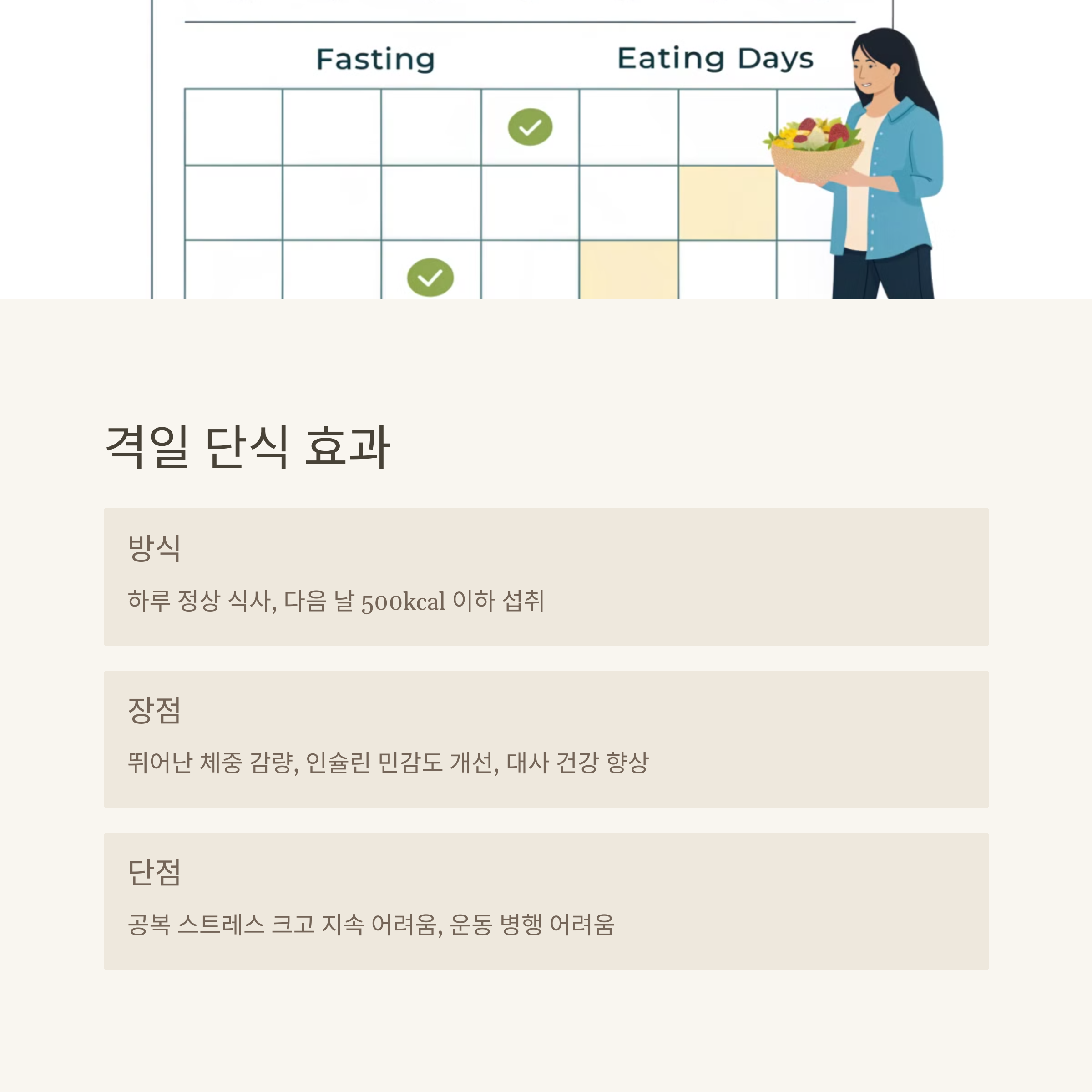 | 체중 감량 효과가 뛰어나며, 인슐린 민감도가 개선됨 | 공복 스트레스가 크고 지속하기 어려움 |
