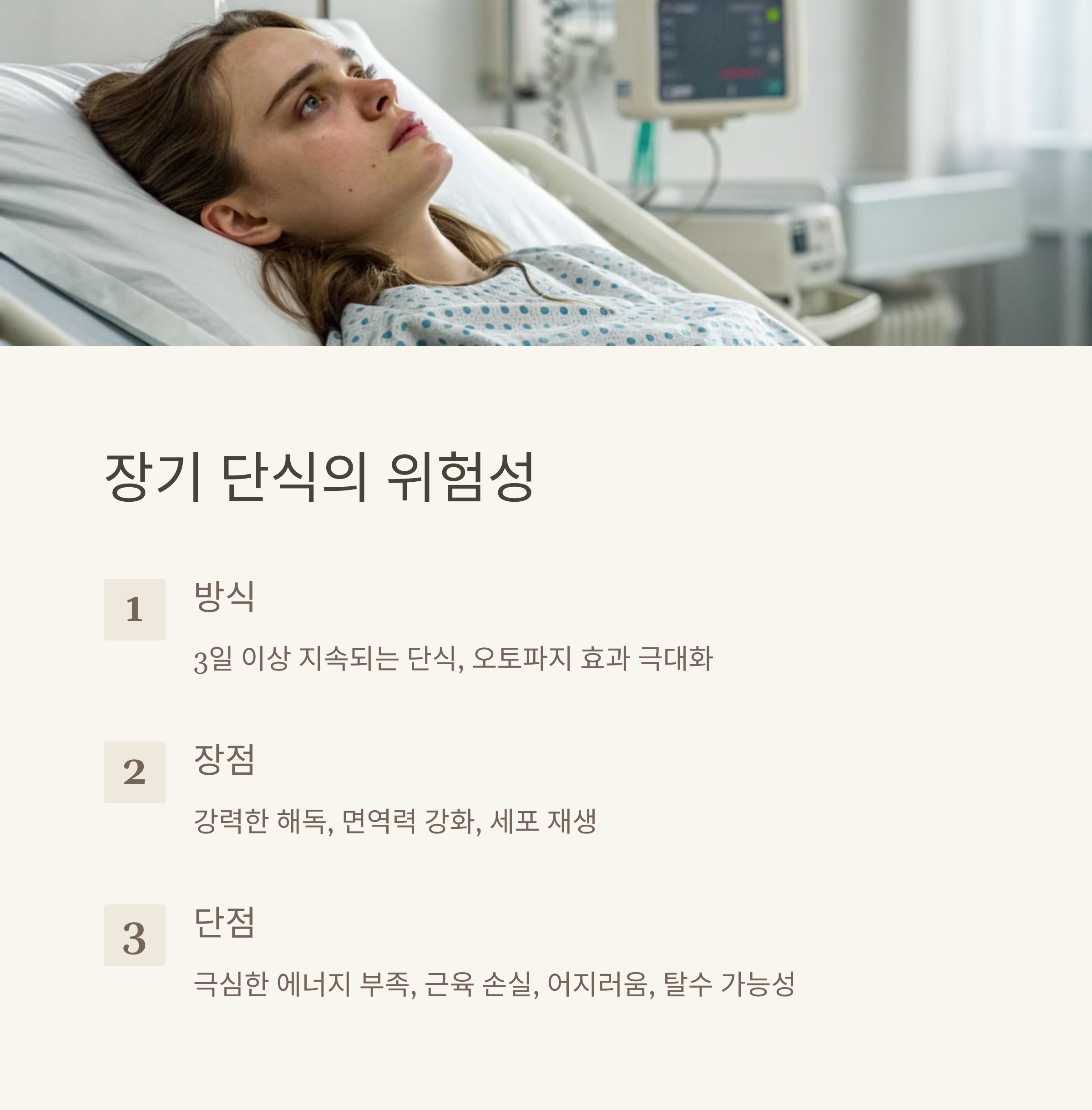 - 단점: 극심한 에너지 부족, 근육 손실, 어지러움 및 탈수 가능성