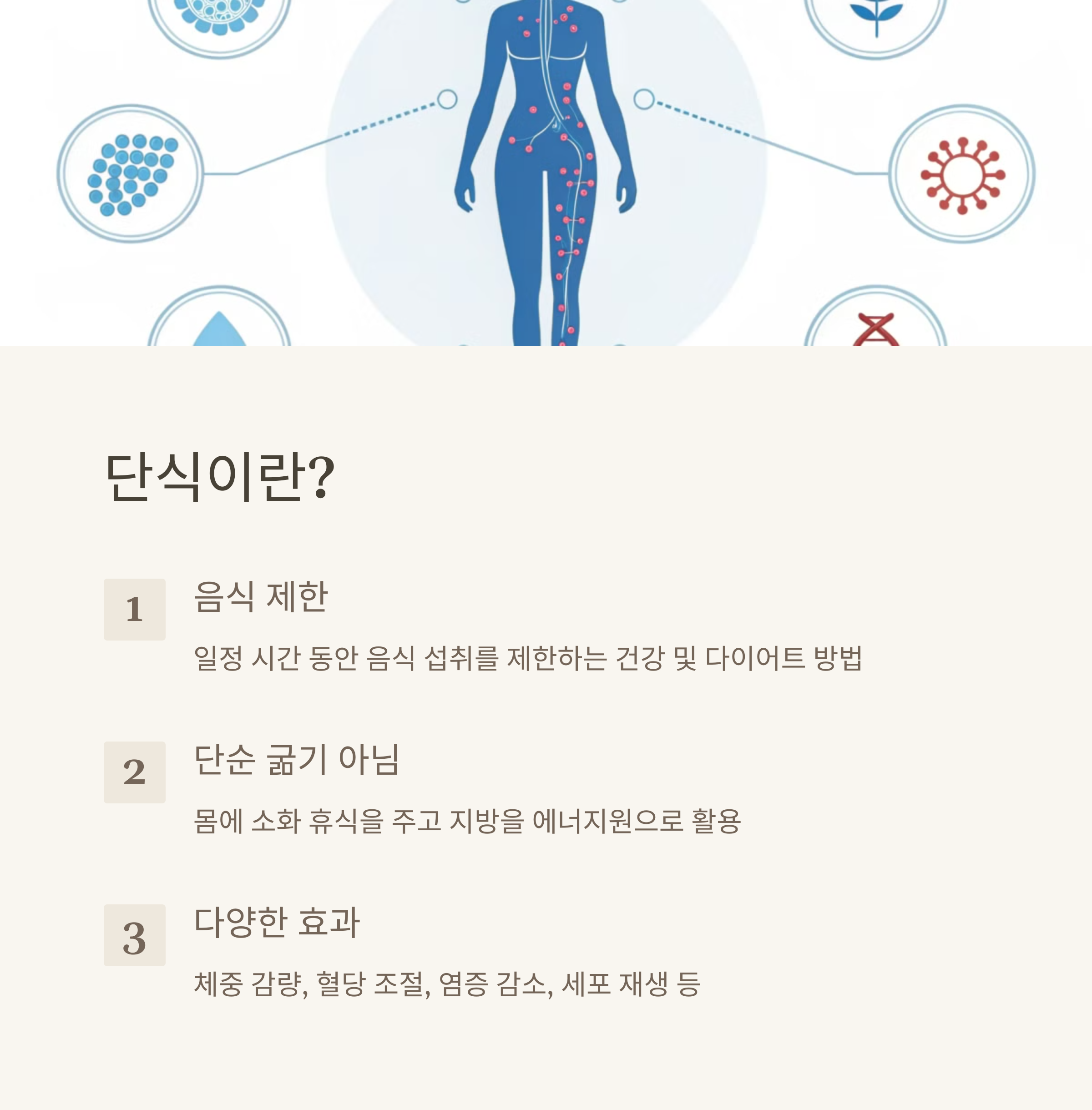 단식(fasting)은 일정 시간 동안 음식 섭취를 제한하는 건강 및 다이어트 방법입니다. 단순히 ‘굶는다’는 개념이 아니라, 우리 몸이 소화 과정 없이 충분한 휴식을 취하고, 지방을 에너지원으로 활용할 수 있도록 돕는 과정이죠. 단식은 단순한 체중 감량뿐만 아니라 혈당 조절, 염증 감소, 세포 재생 등의 효과를 기대할 수 있어 많은 사람들이 관심을 가지고 있어요.