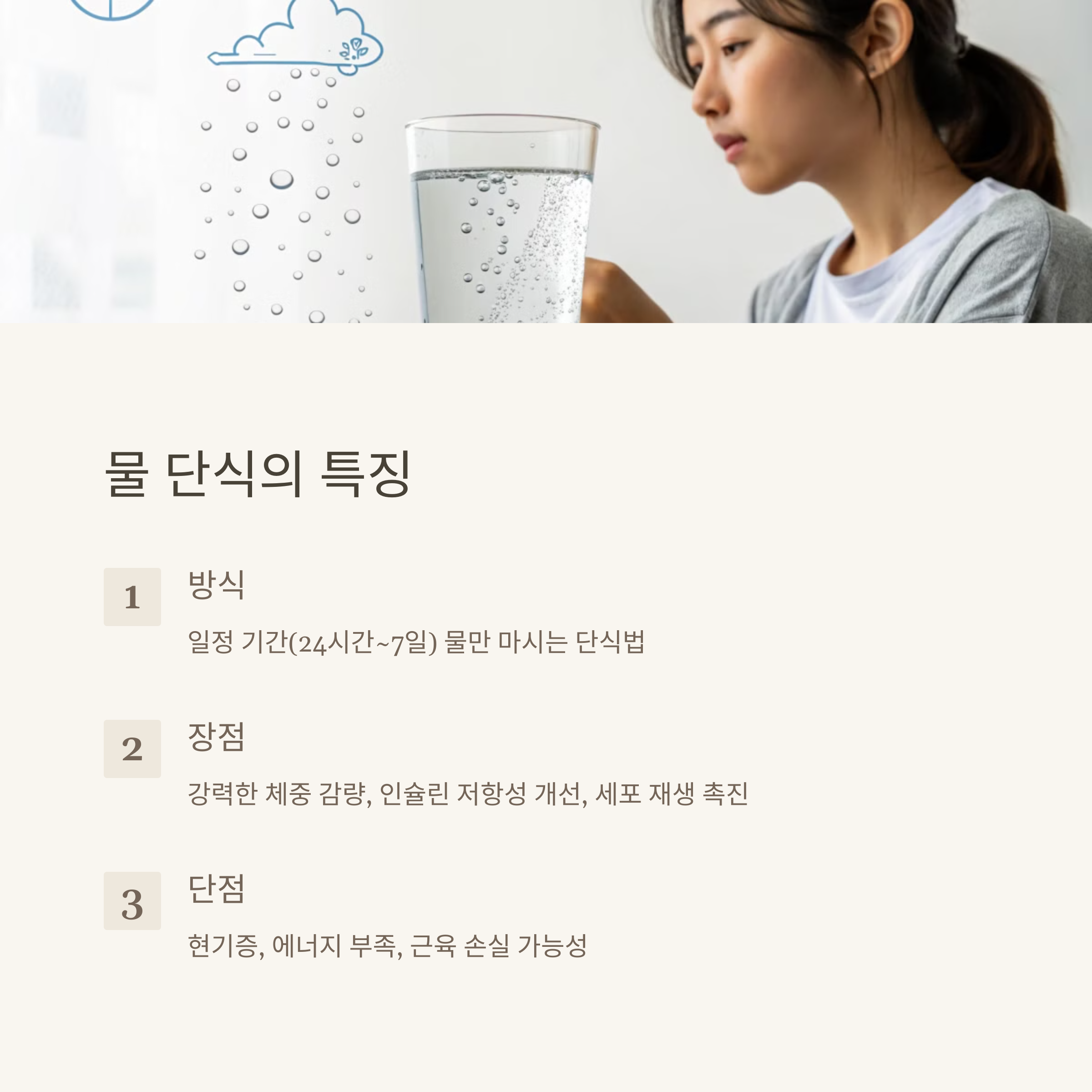 물 단식은 일정 기간 동안 물만 마시면서 음식을 섭취하지 않는 단식 방법이에요. 일반적으로 24시간에서 최대 3~7일까지 지속될 수 있으며, 세포 재생 효과(오토파지)가 높다고 알려져 있어요.