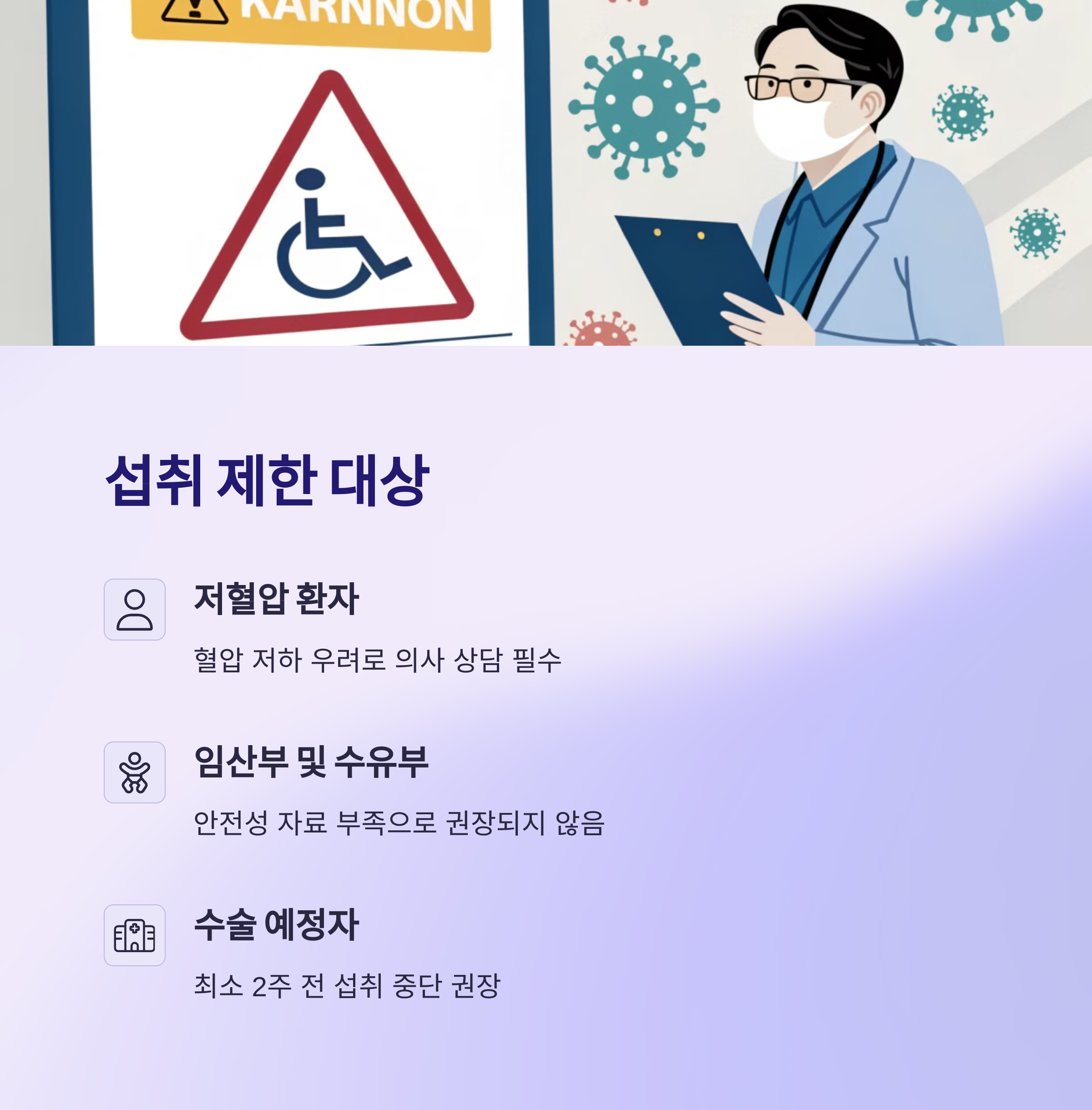 - 저혈압 환자: 혈압 저하 우려로 복용 전 의사 상담 필수