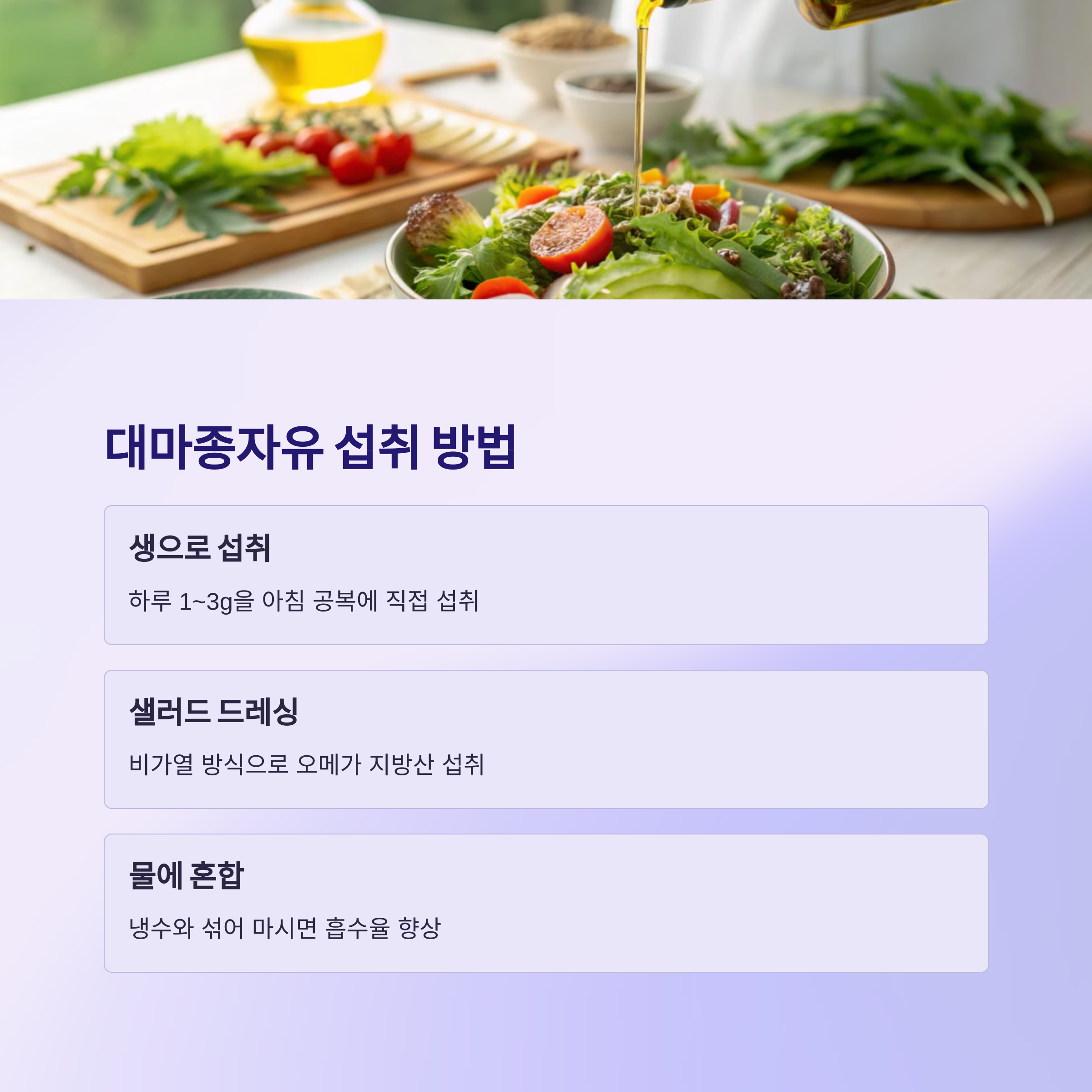 | 샐러드 드레싱 | 오메가 지방산 섭취를 위한 비가열 방식 추천 |