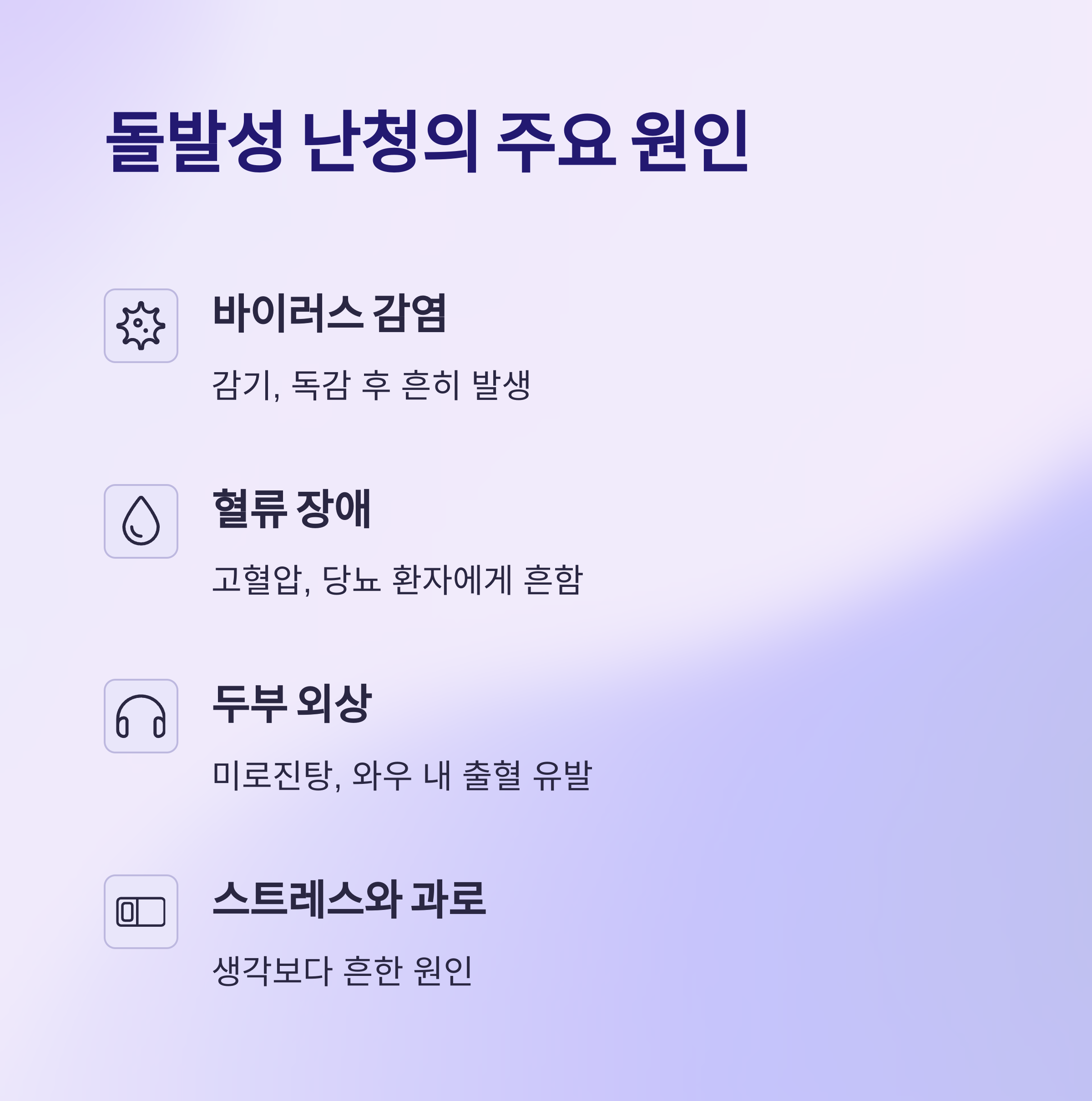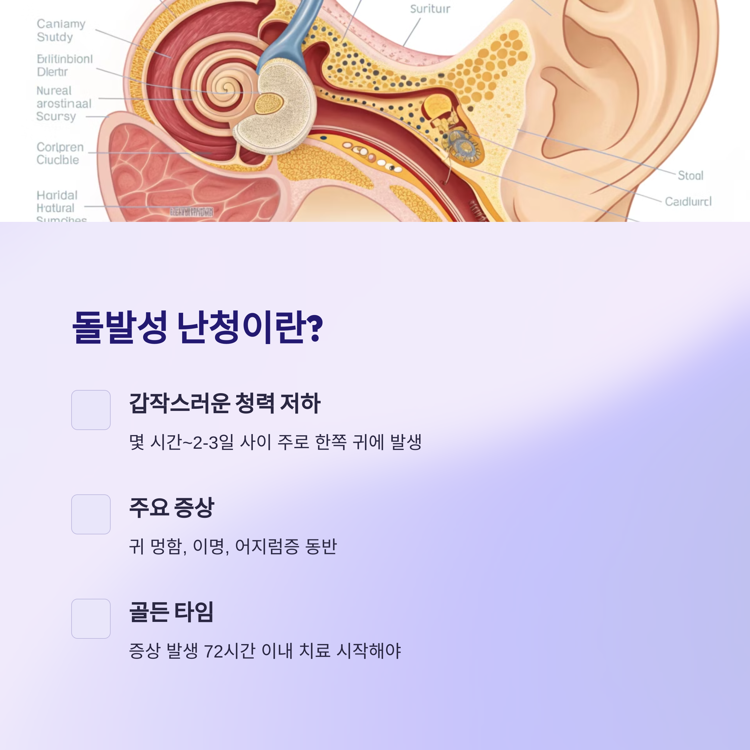 몇 시간에서 2~3일 사이, 주로 한쪽 귀에 감각신경성 난청이 발생하죠. 문제는 대부분 원인이 명확하지 않다는 거예요.