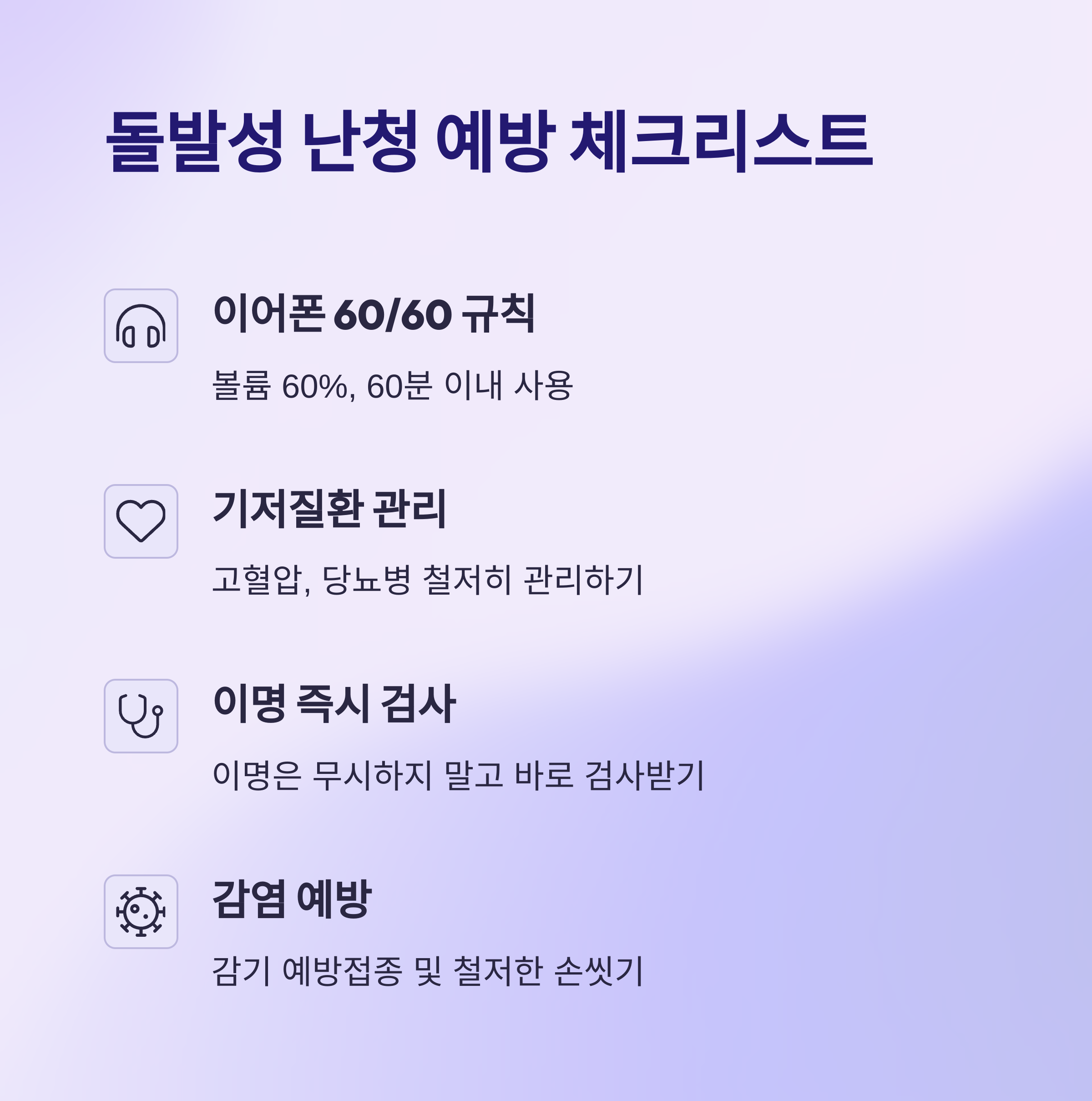 돌발성 난청은 예고 없이 찾아오지만, 몇 가지 생활 습관만 바꿔도 위험을 확실히 줄일 수 있어요.