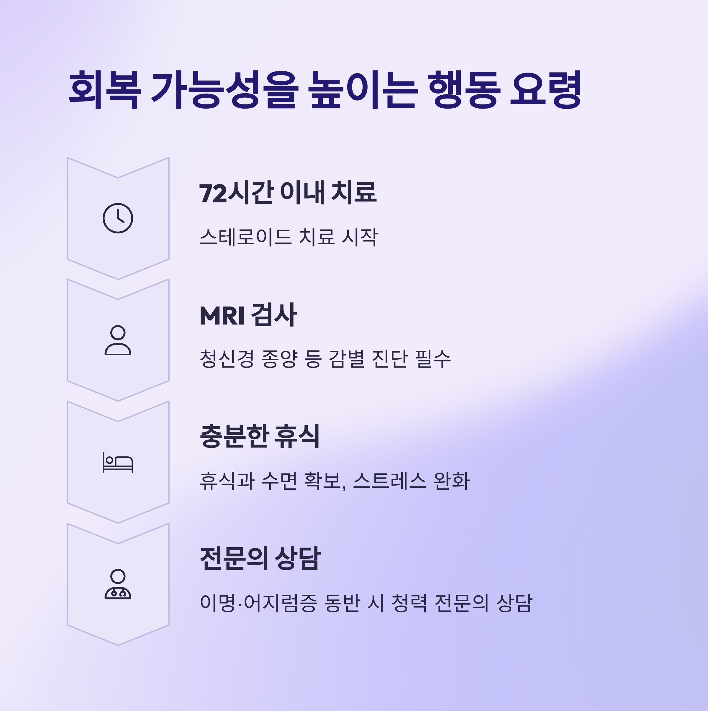 - 청력 저하 72시간 이내 스테로이드 치료 시작