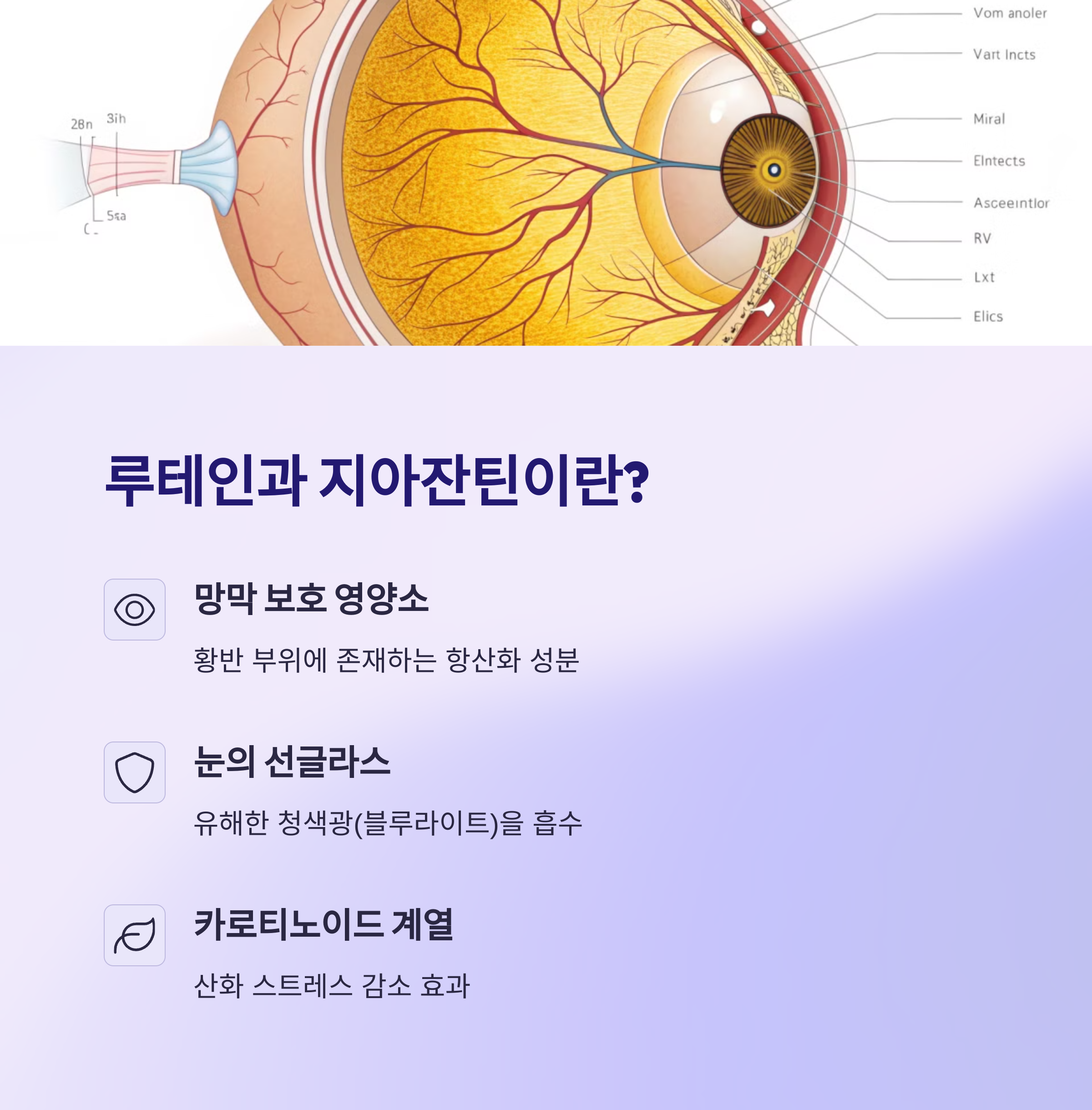 루테인과 지아잔틴은 우리 눈의 망막, 특히 중심 시력을 담당하는 황반 부위에 자연스럽게 존재하는 항산화 영양소입니다.