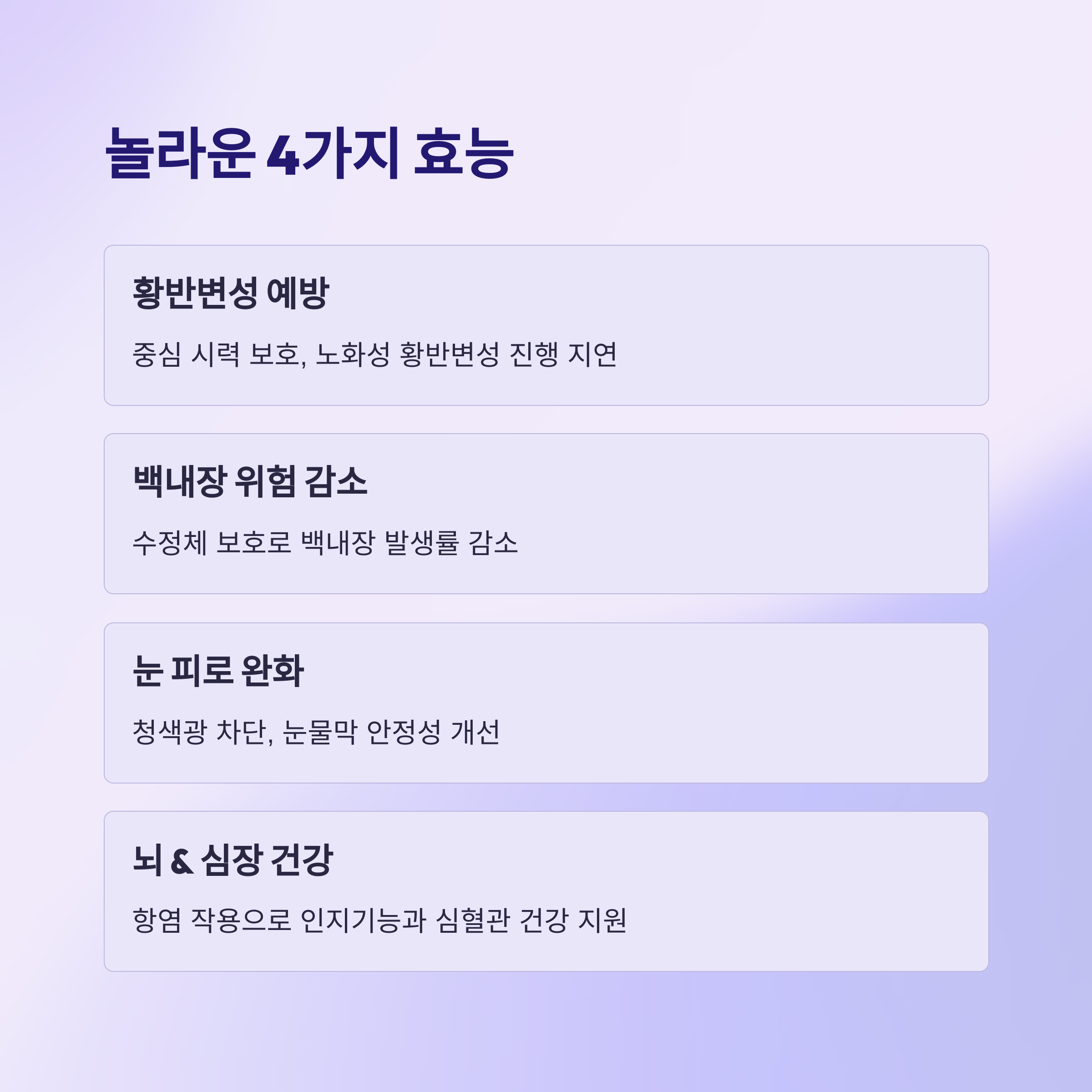 | 백내장 위험 감소 | 산화 스트레스로부터 수정체를 보호해 백내장 발생률을 낮춥니다 |