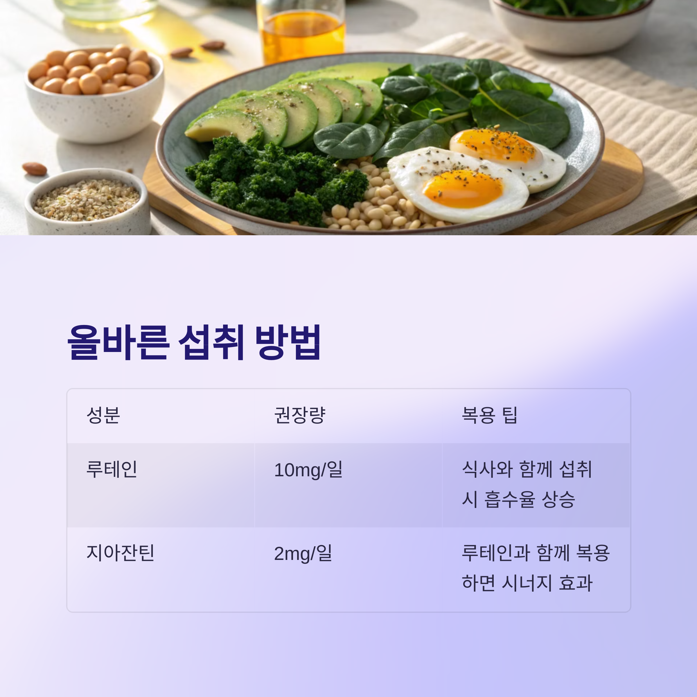 | 루테인 | 10mg/일 | 식사와 함께 섭취 시 흡수율 상승 |