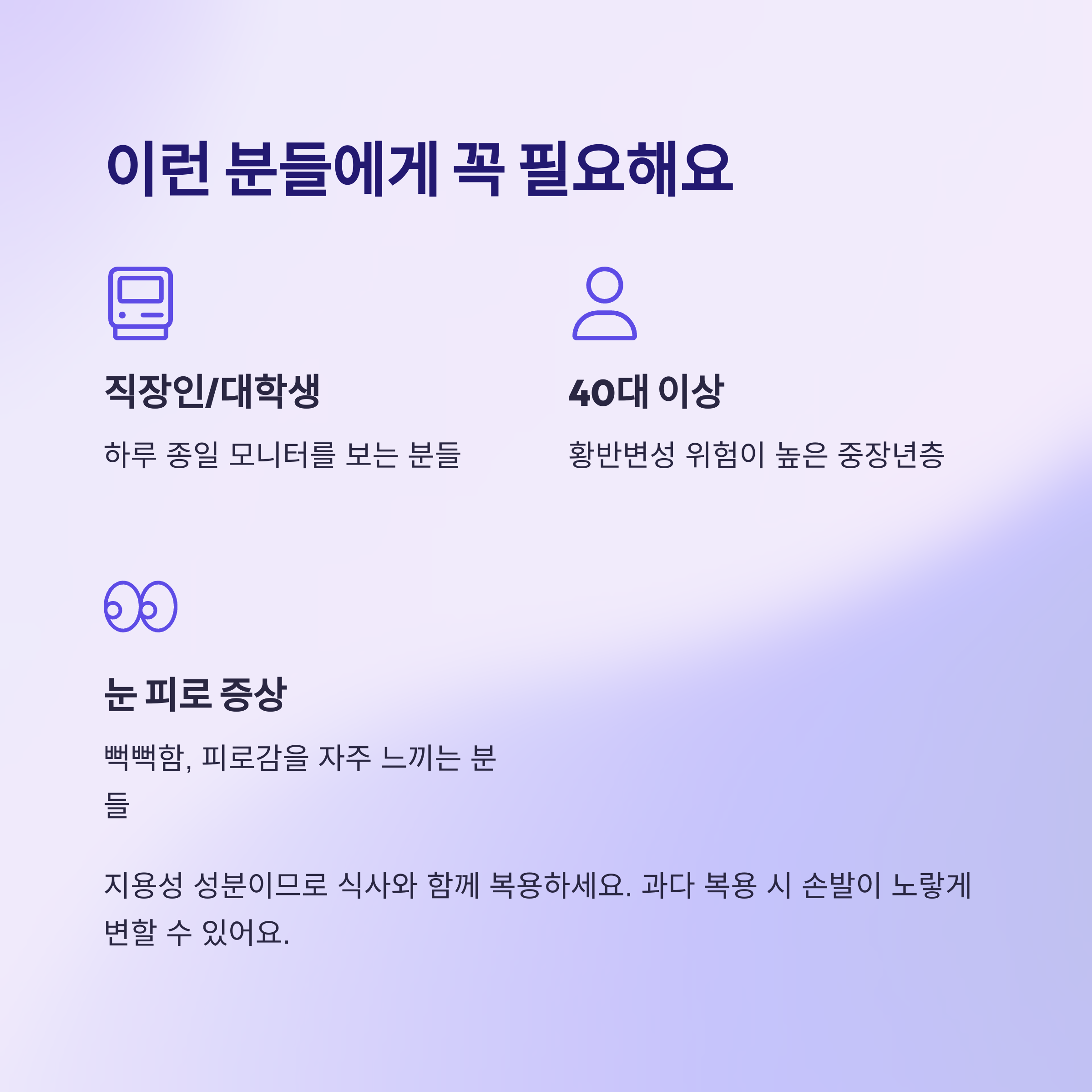 | 눈 피로 완화 | 청색광을 차단하고 눈물막 안정성 개선으로 피로도를 줄입니다 |