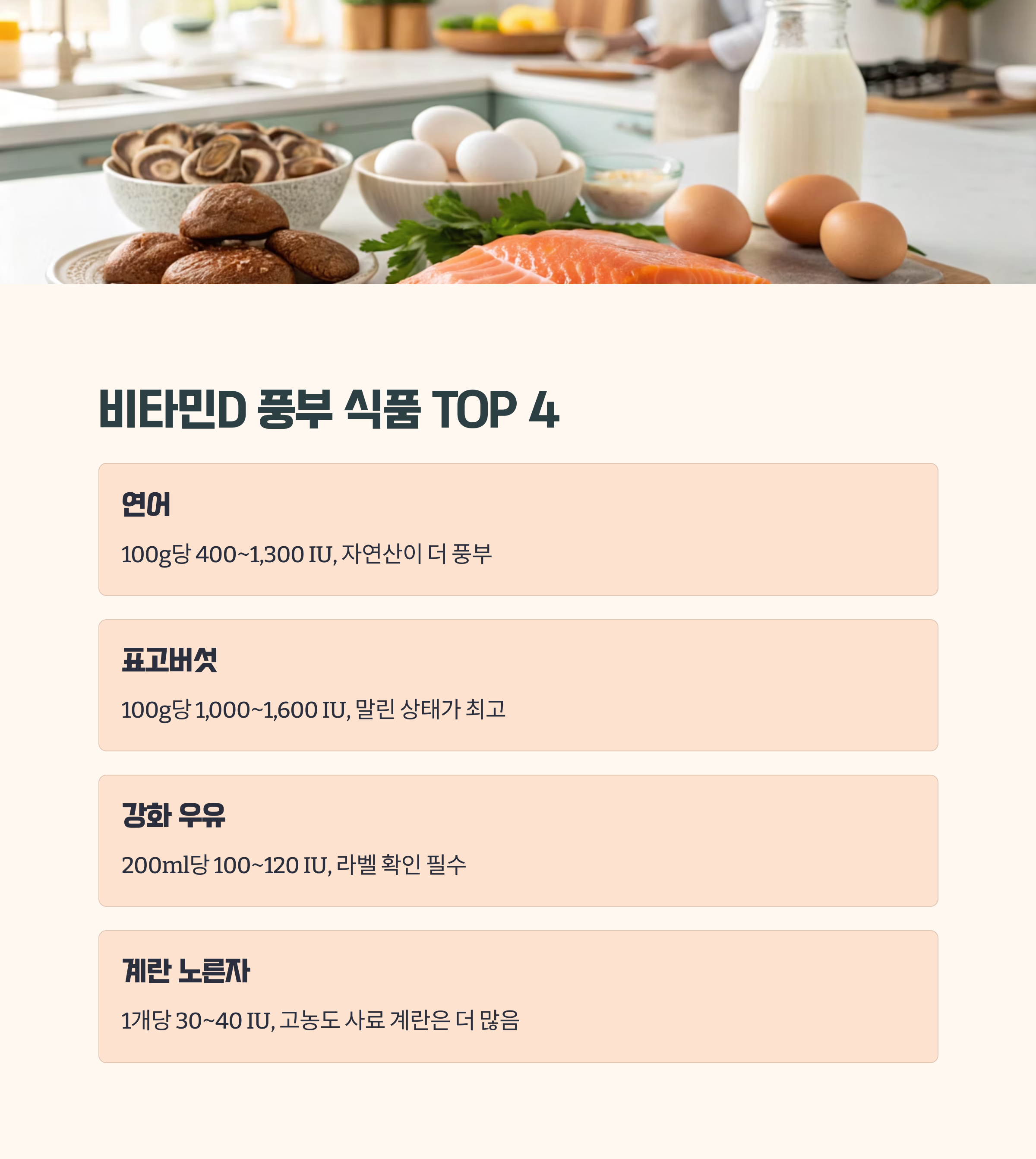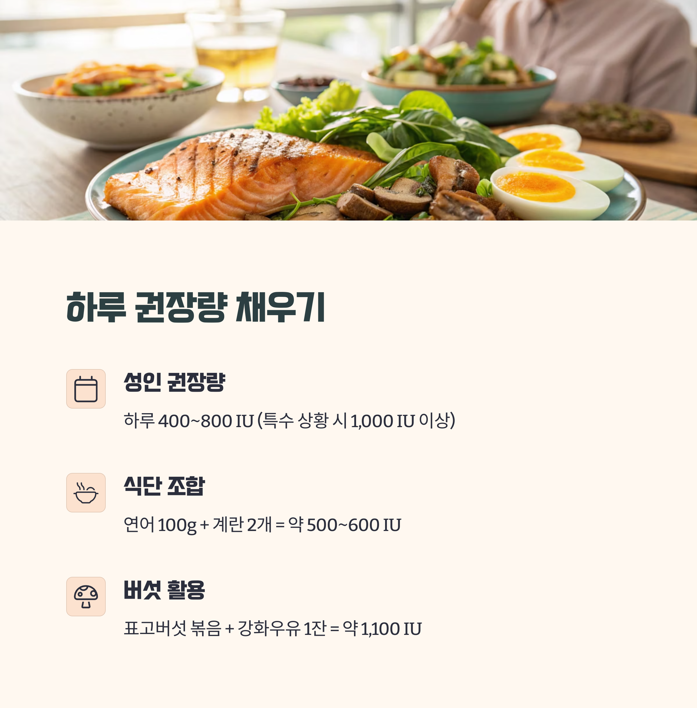 | 비타민D 강화 우유 | 100~120 IU (200ml 기준) | 라벨 확인 필수 |