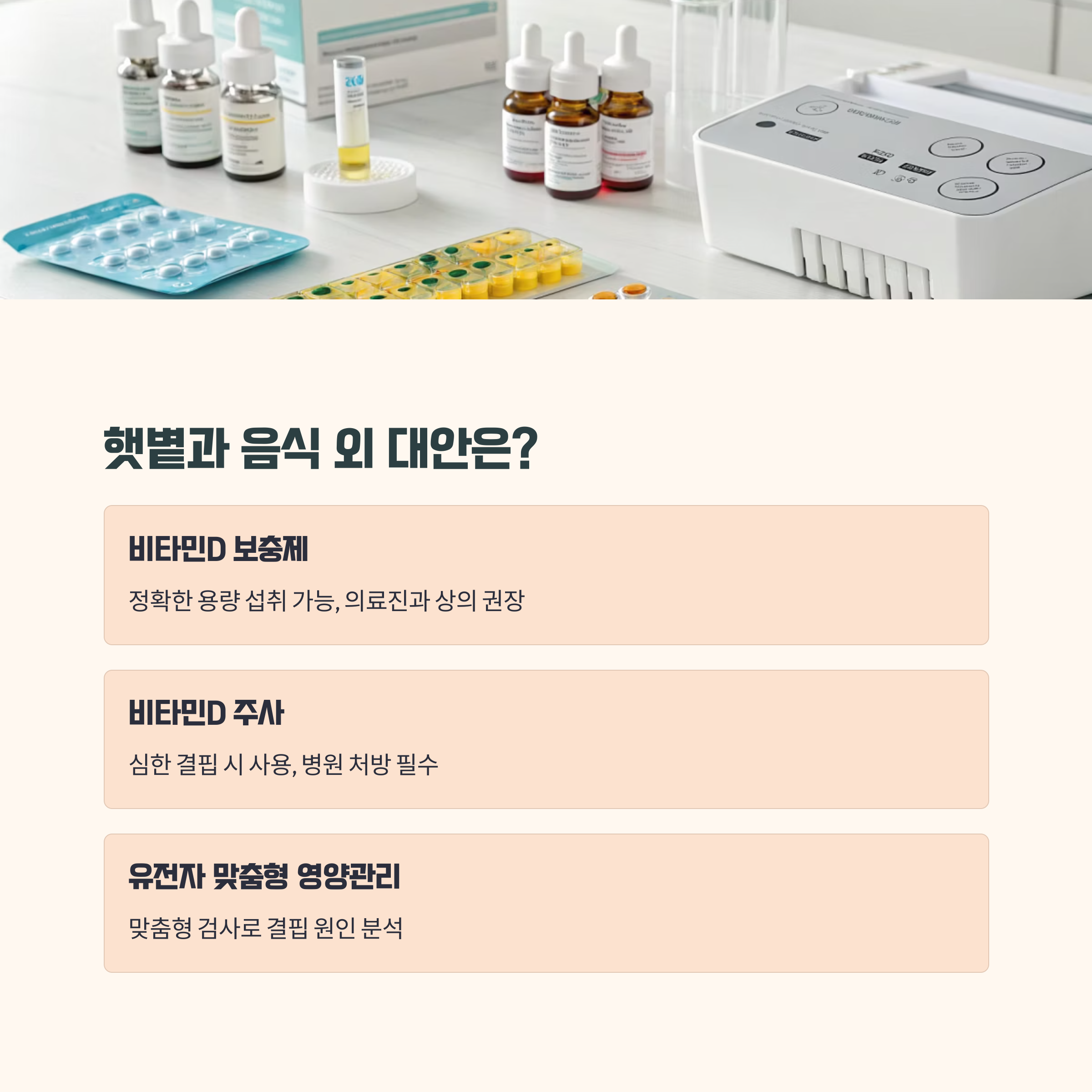 | 비타민D 보충제 | 정확한 용량을 섭취 가능. 의료진과 상의 후 복용 권장 |