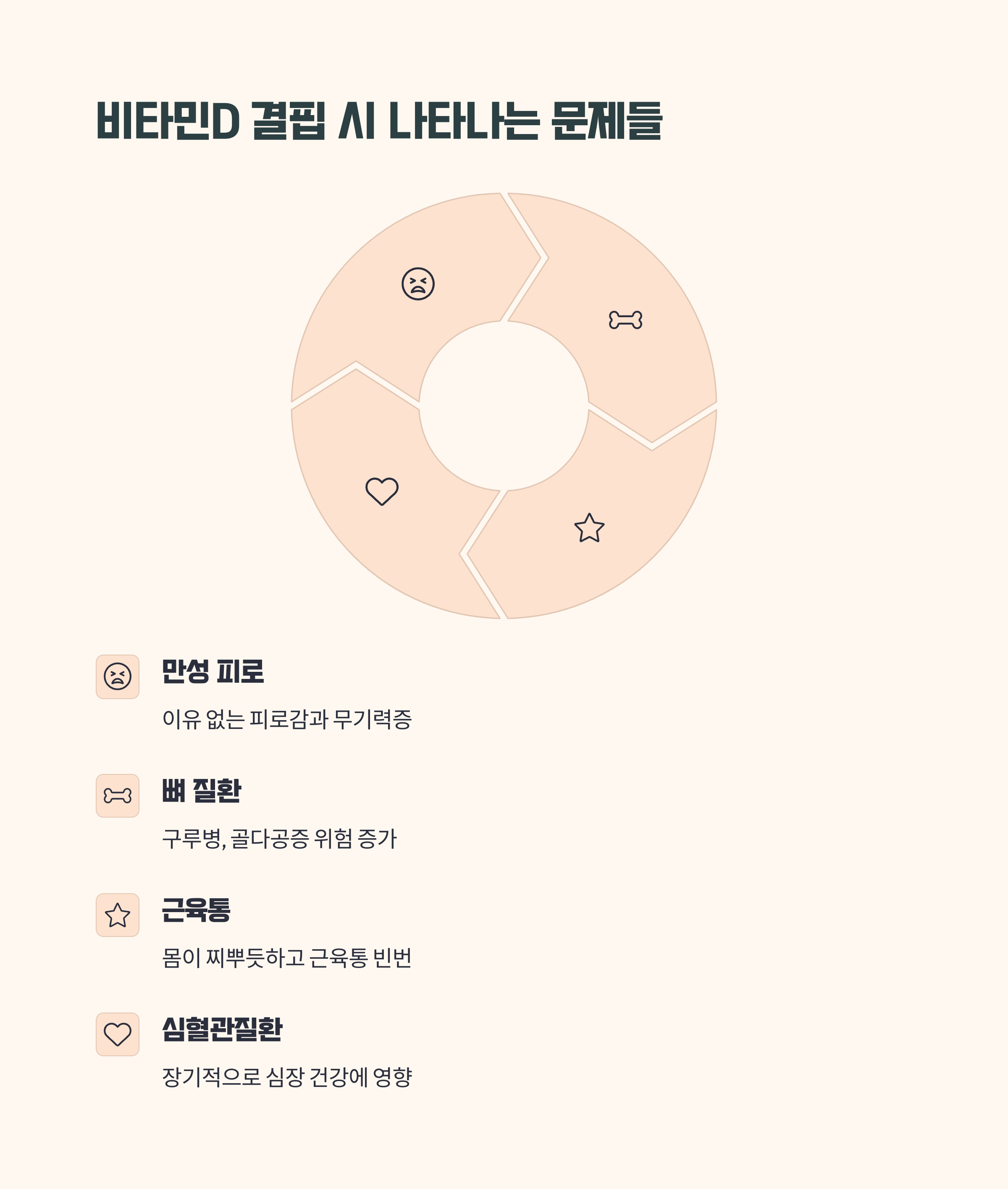 결핍될 경우, 구루병이나 골다공증 같은 뼈 질환뿐 아니라, 감염병에 더 취약해지고, 우울감이나 만성 피로 등 정신적인 증상도 동반될 수 있어요.