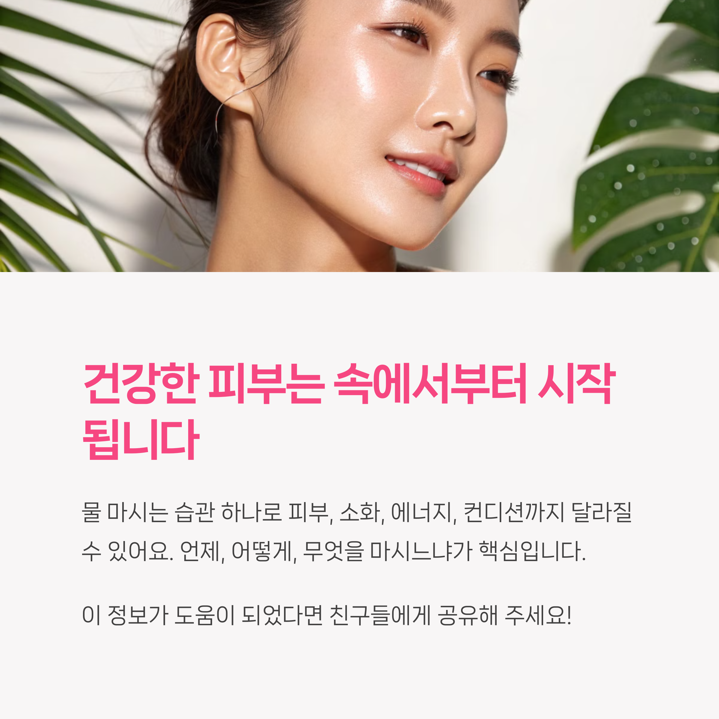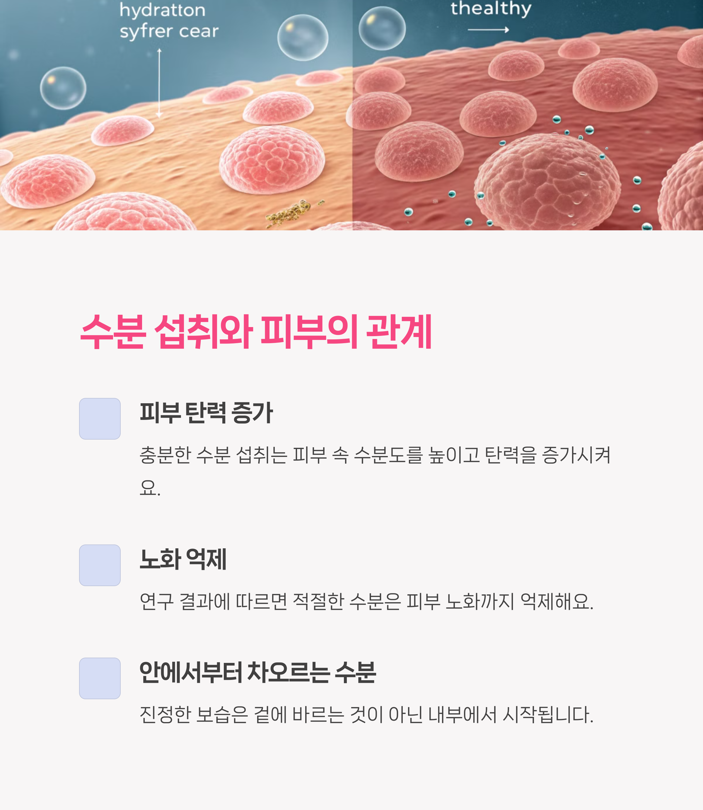 물은 기본일 뿐이에요. 충분한 수면, 균형 잡힌 식사, 올바른 스킨케어가 함께 이뤄져야 피부가 진짜 좋아질 수 있어요.