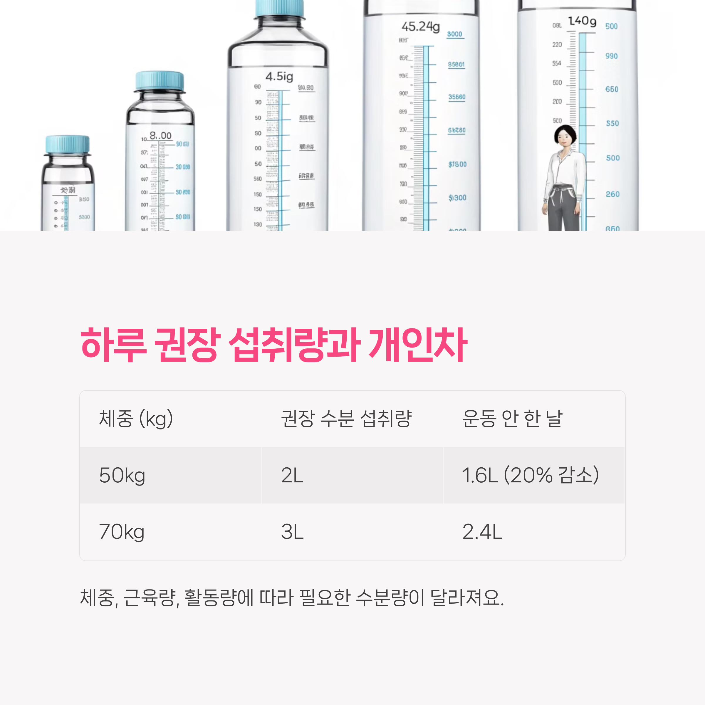 일반적으로 50kg 성인의 경우 하루 2L 정도의 물을 권장하지만, 이건 어디까지나 평균값이에요.