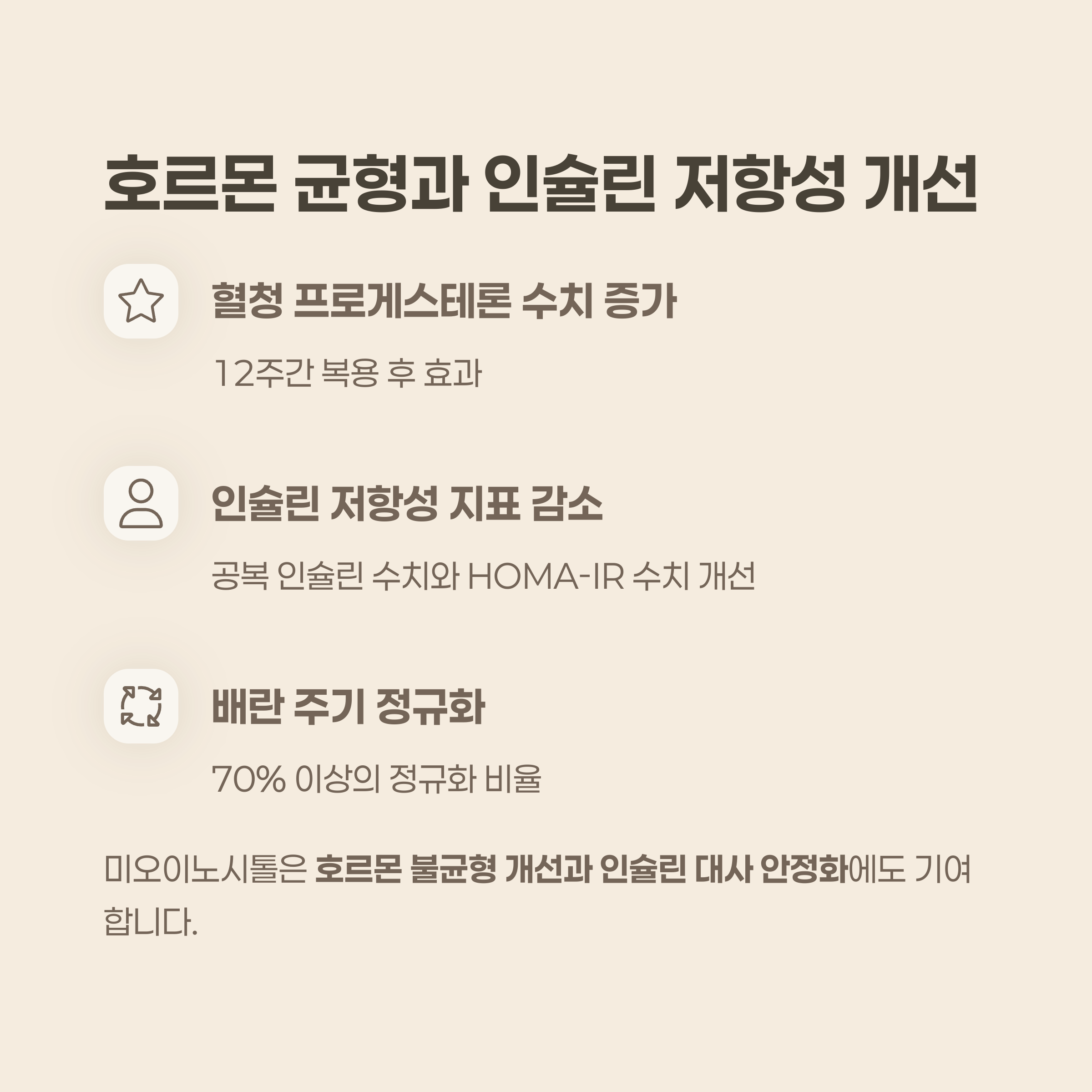 핵심: 미오이노시톨은 호르몬 불균형 개선과 인슐린 대사 안정화에도 기여합니다.