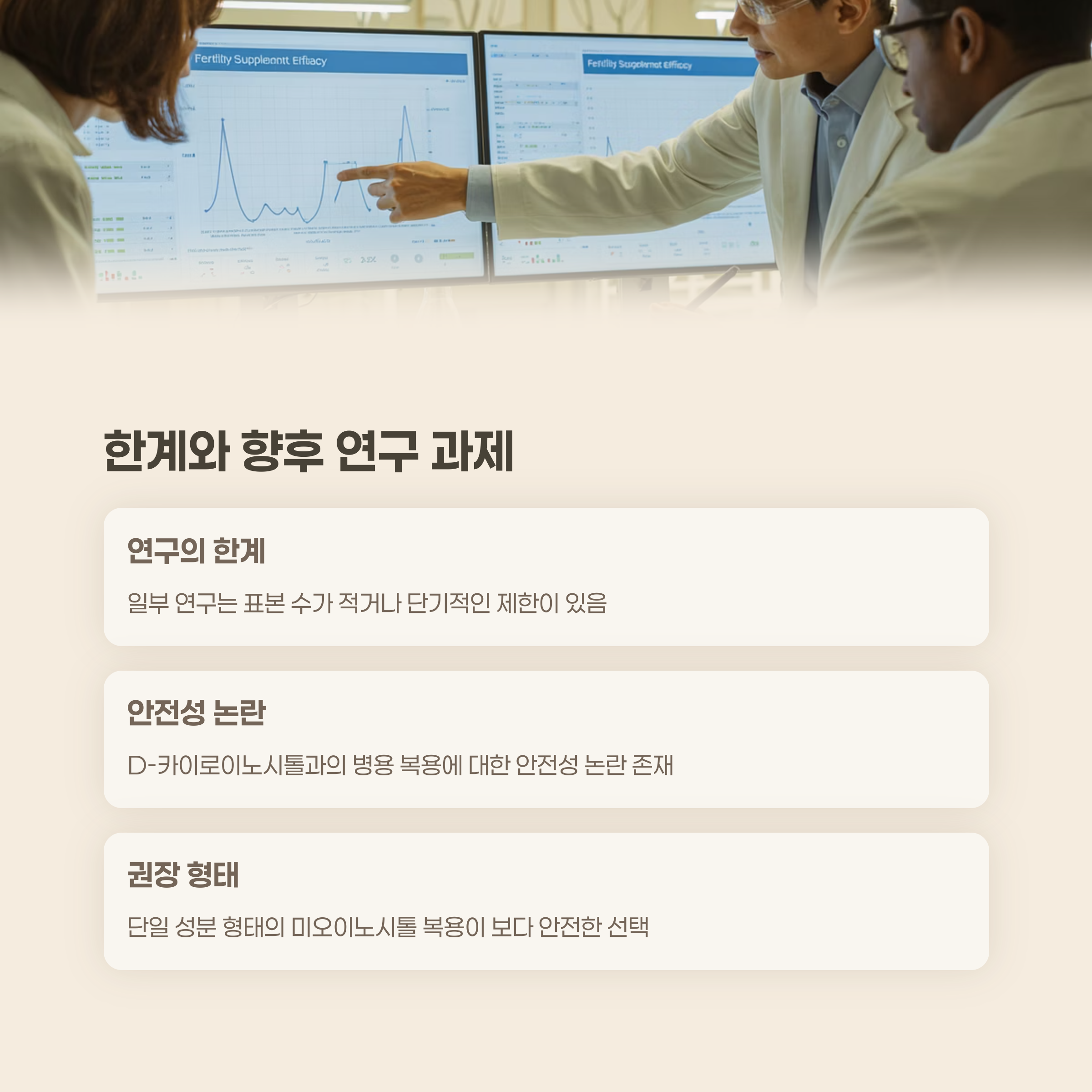 따라서 현재로서는 단일 성분 형태의 미오이노시톨 복용이 보다 안전한 선택으로 평가되고 있습니다.