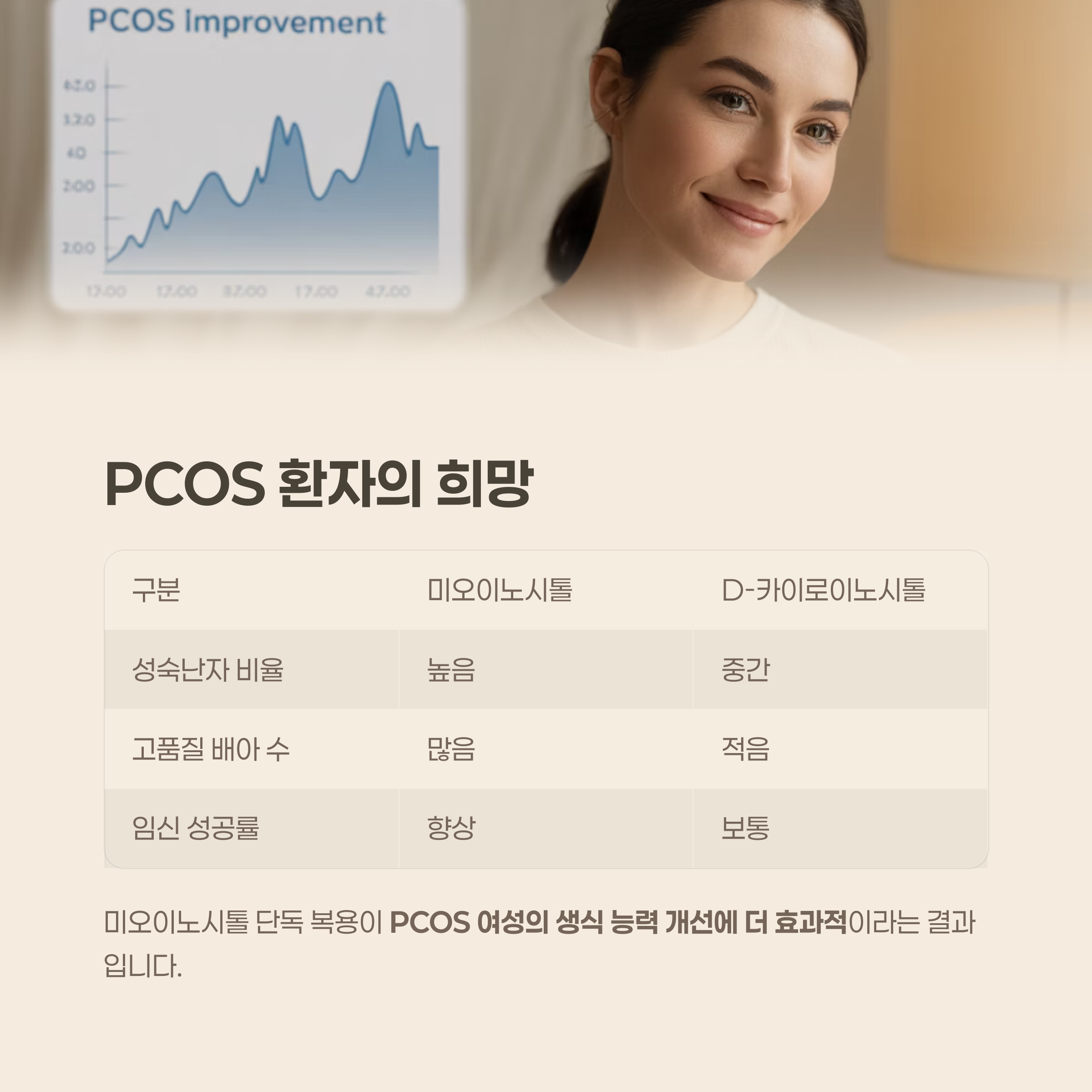 핵심: 미오이노시톨 단독 복용이 PCOS 여성의 생식 능력 개선에 더 효과적이라는 결과입니다.