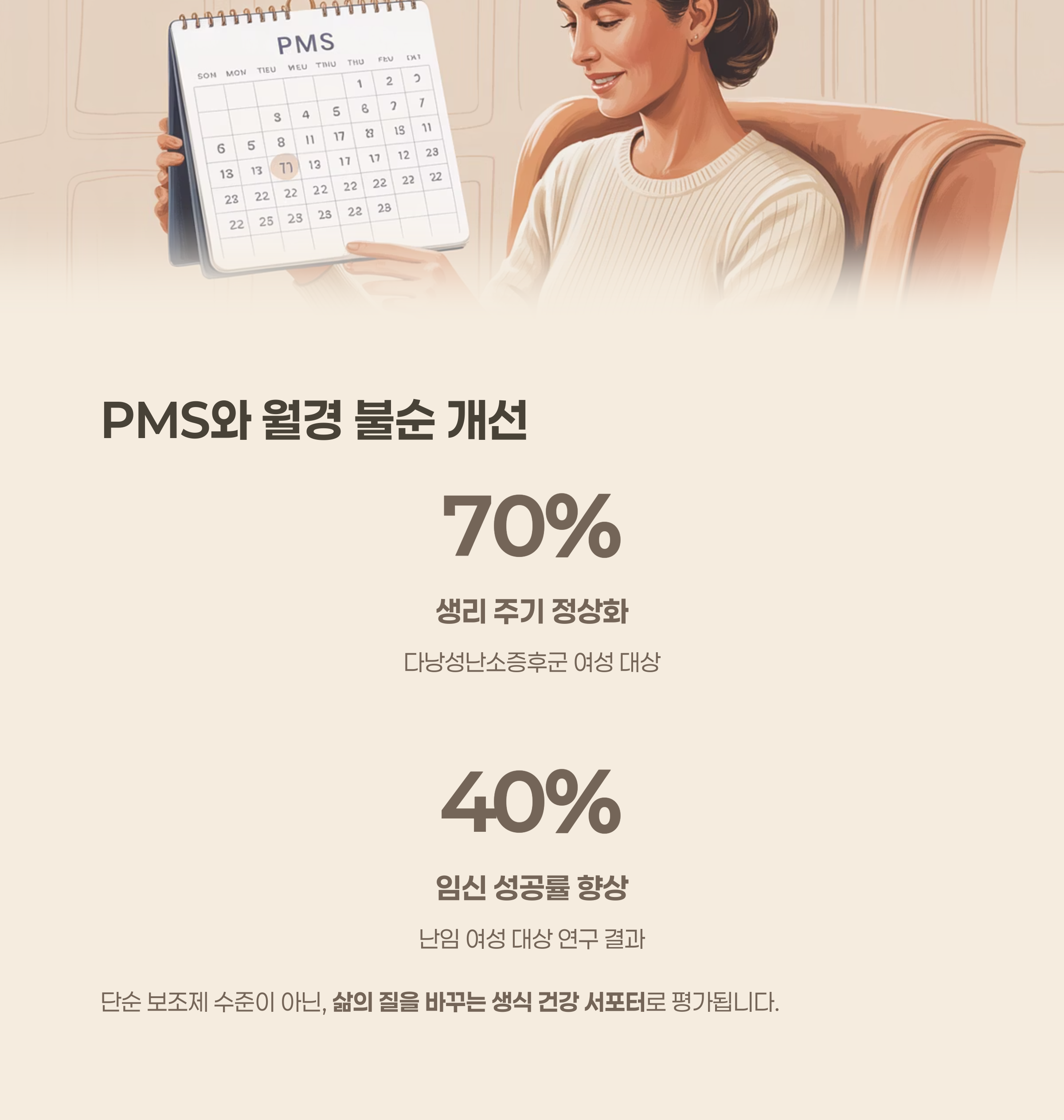 다낭성난소증후군(PMS 포함) 여성의 70% 이상이 생리 주기 정상화를 경험했고,