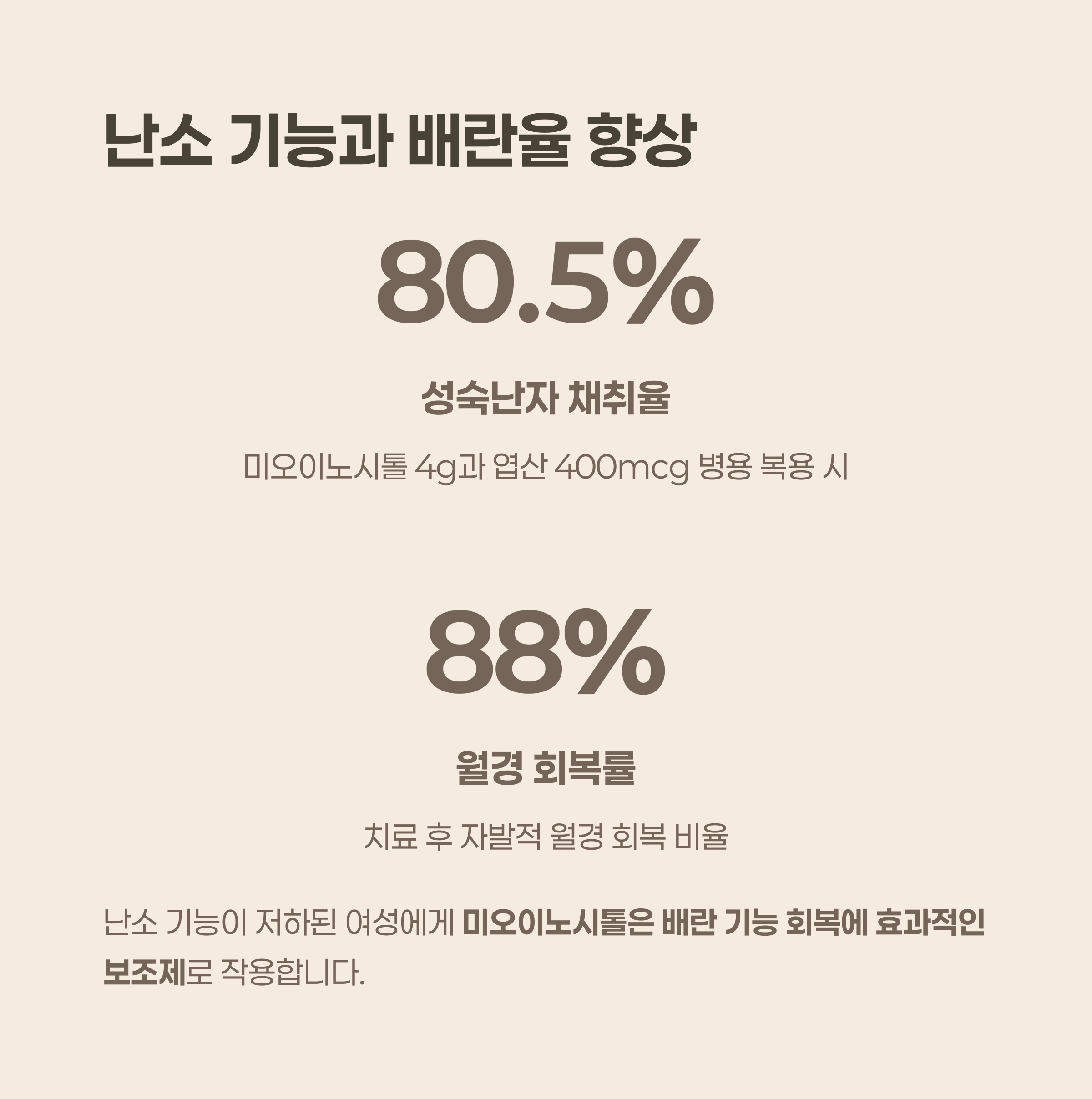 미오이노시톨 4g과 엽산 400mcg 병용 복용 시, 대조군보다 성숙난자 채취율이 80.5%로 유의하게 향상되었습니다.