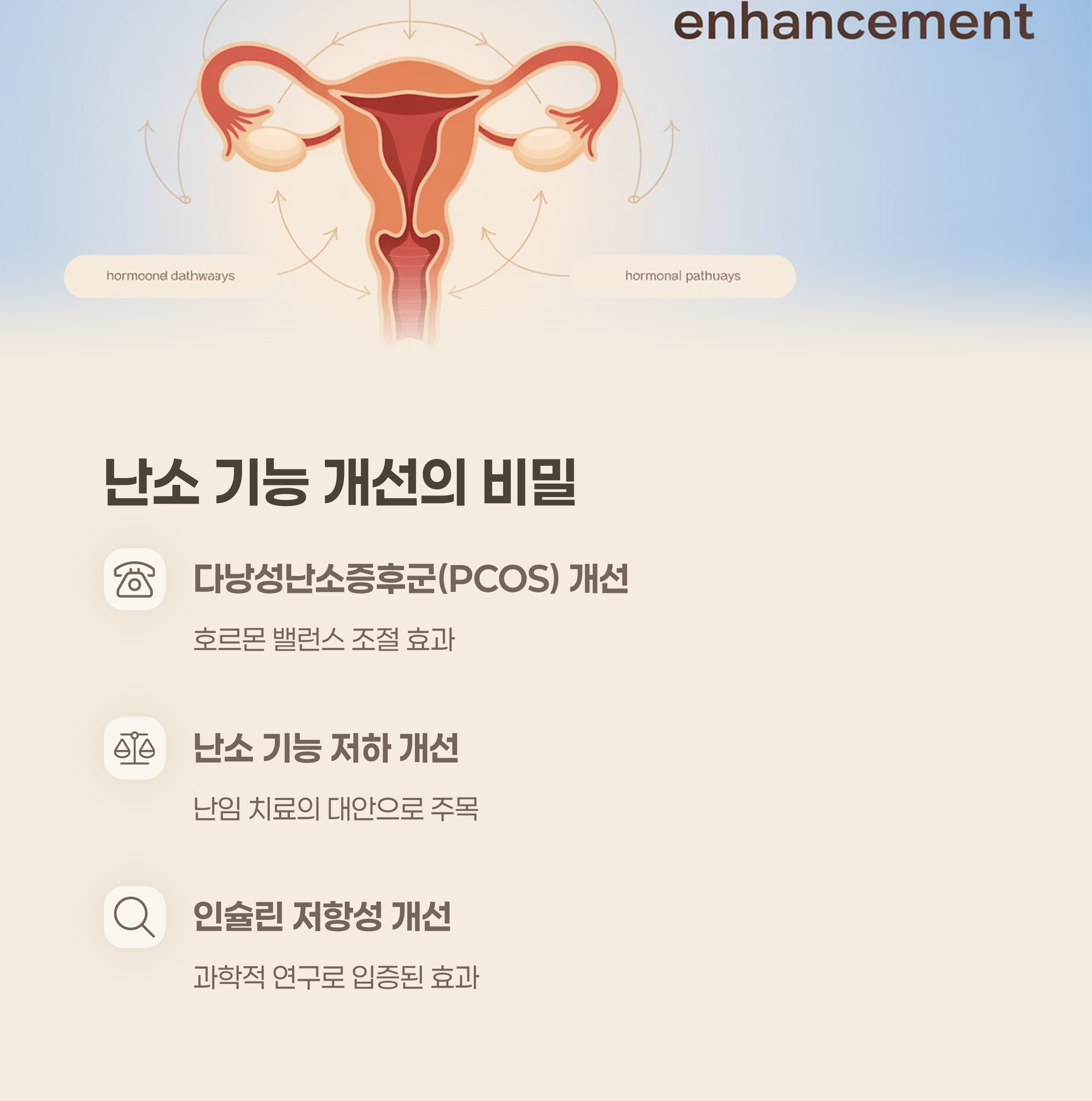 최근에는 호르몬 밸런스 조절 및 인슐린 저항성 개선 효과까지 밝혀져 난임 치료의 대안으로 주목받고 있습니다.
