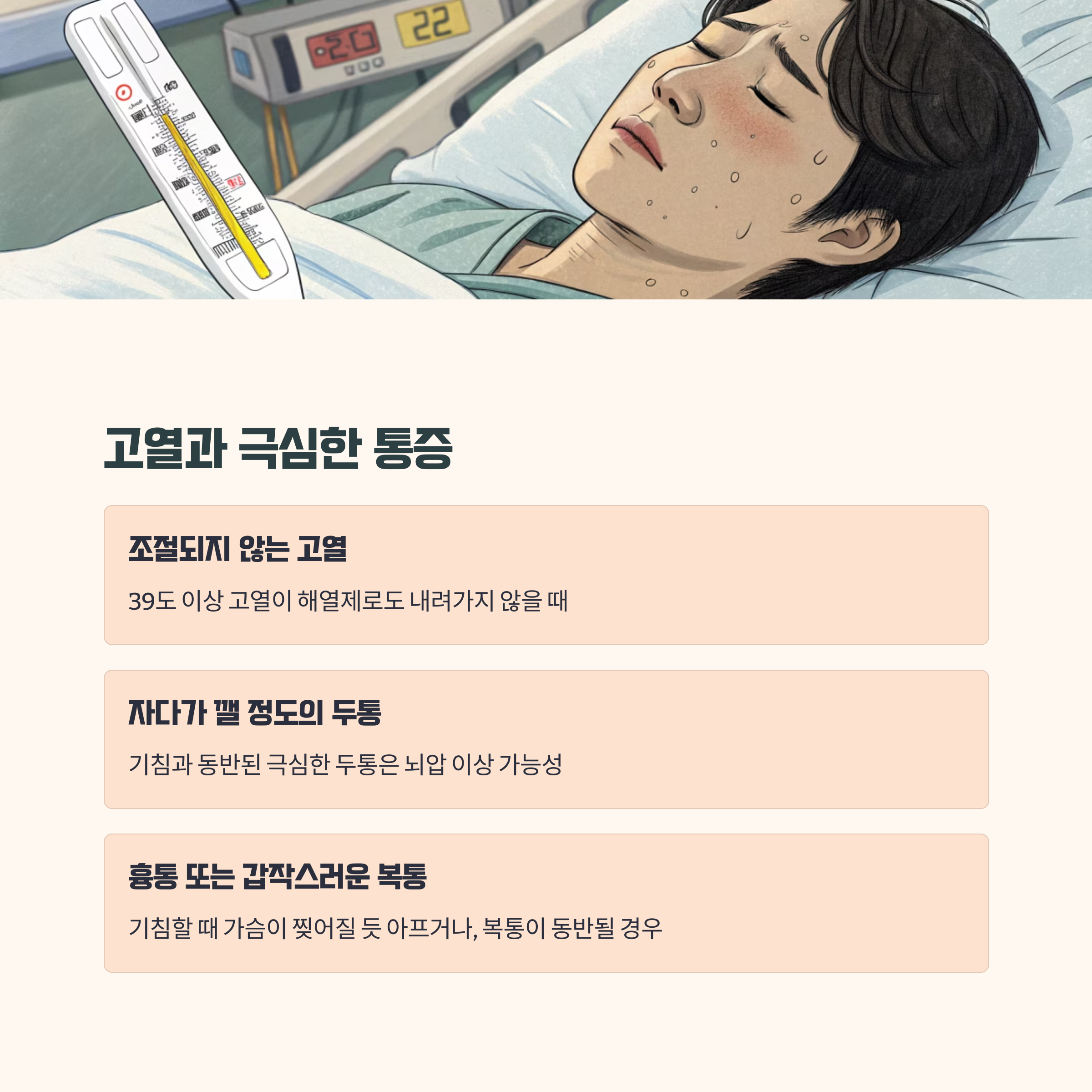 기침과 함께 39도 이상의 고열이 지속되거나, 해열제를 써도 조절되지 않는다면 응급 상황을 의심해야 해요.