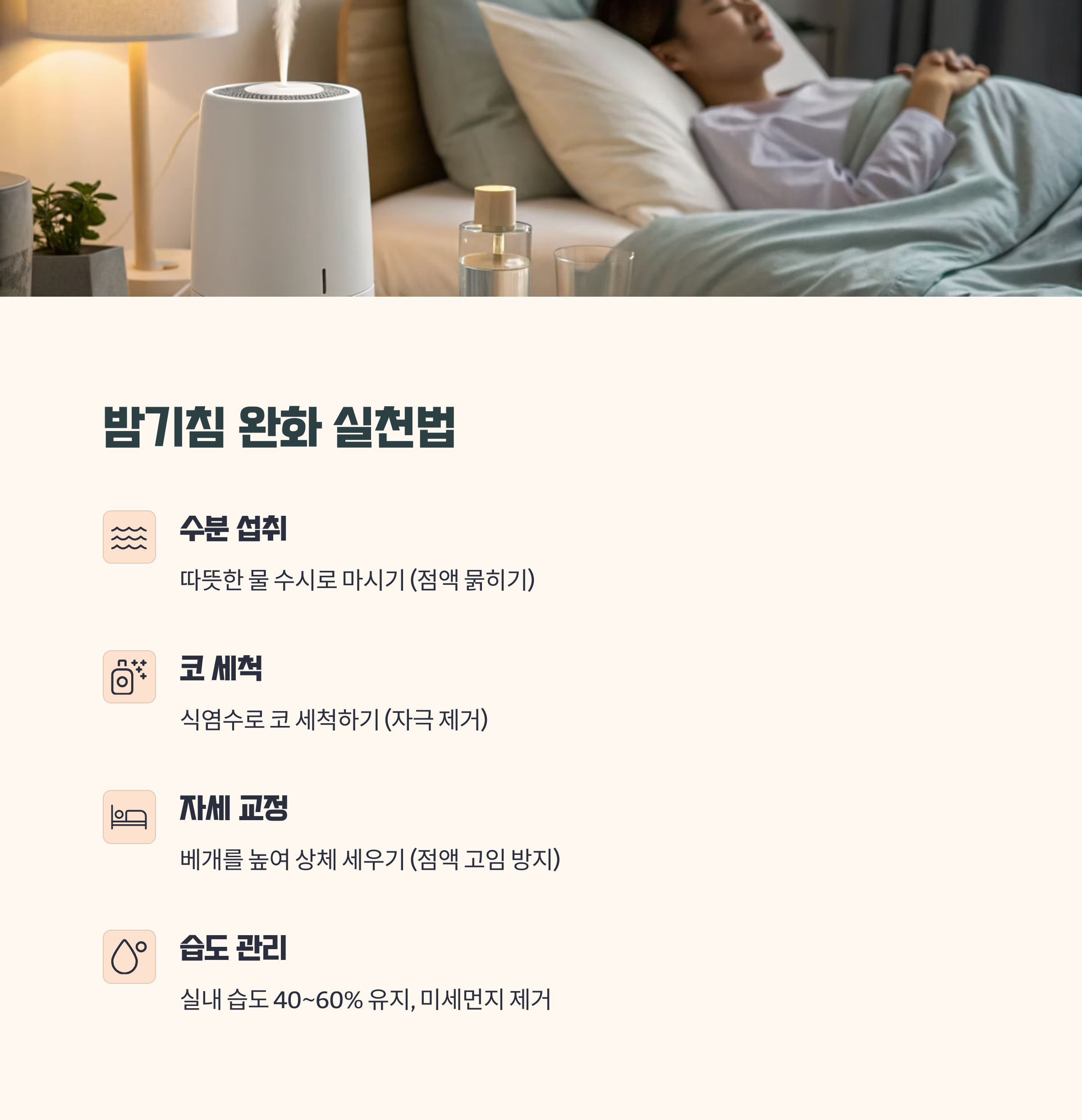위험 신호가 없다면 다행이지만, 그렇다고 밤기침을 그대로 두기엔 삶의 질이 너무 떨어지죠.