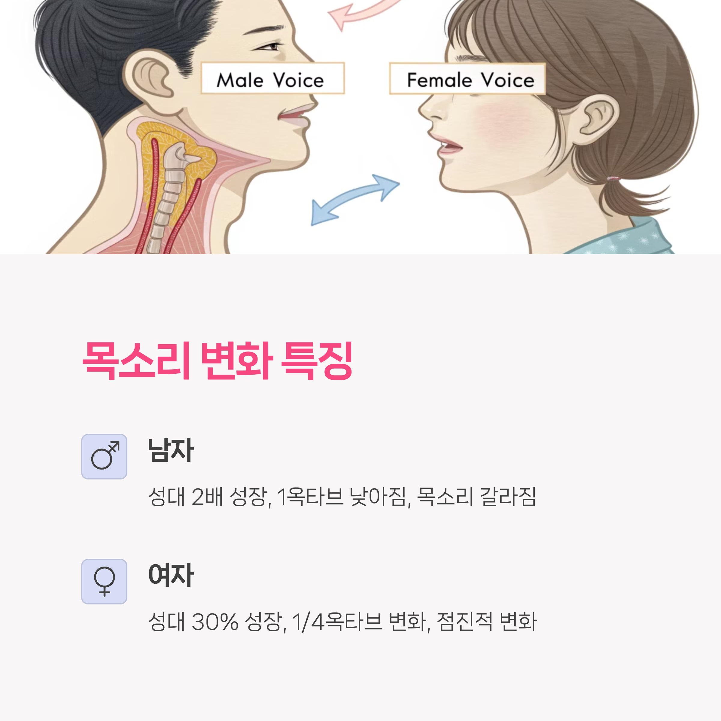 • 남자는 성대가 최대 2배까지 자라며 목소리가 1옥타브 낮아짐