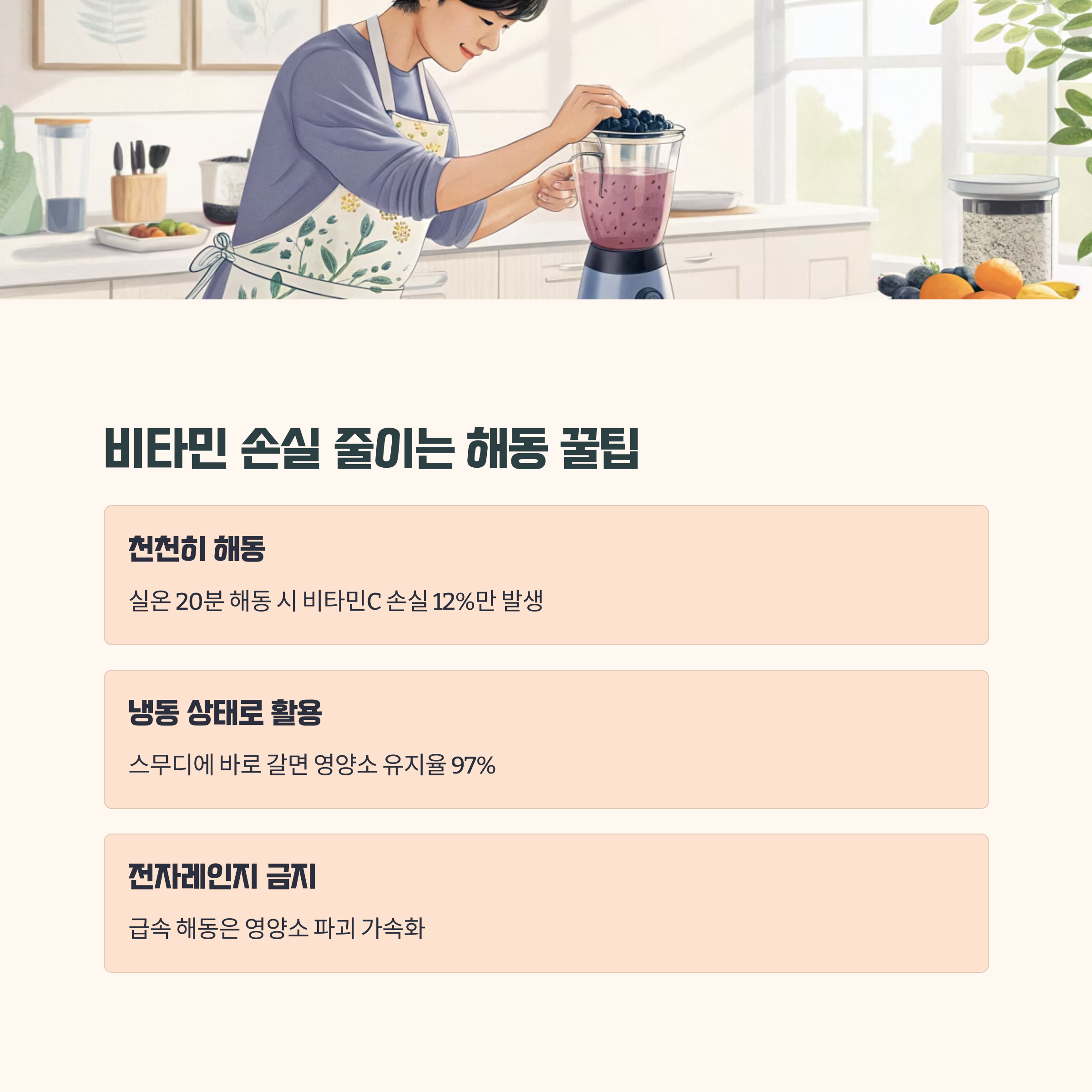 실온에서 20분 정도 천천히 녹이거나, 스무디에 바로 사용하는 게 가장 좋습니다. 급속 해동은 비타민C 손실을 증가시킵니다.