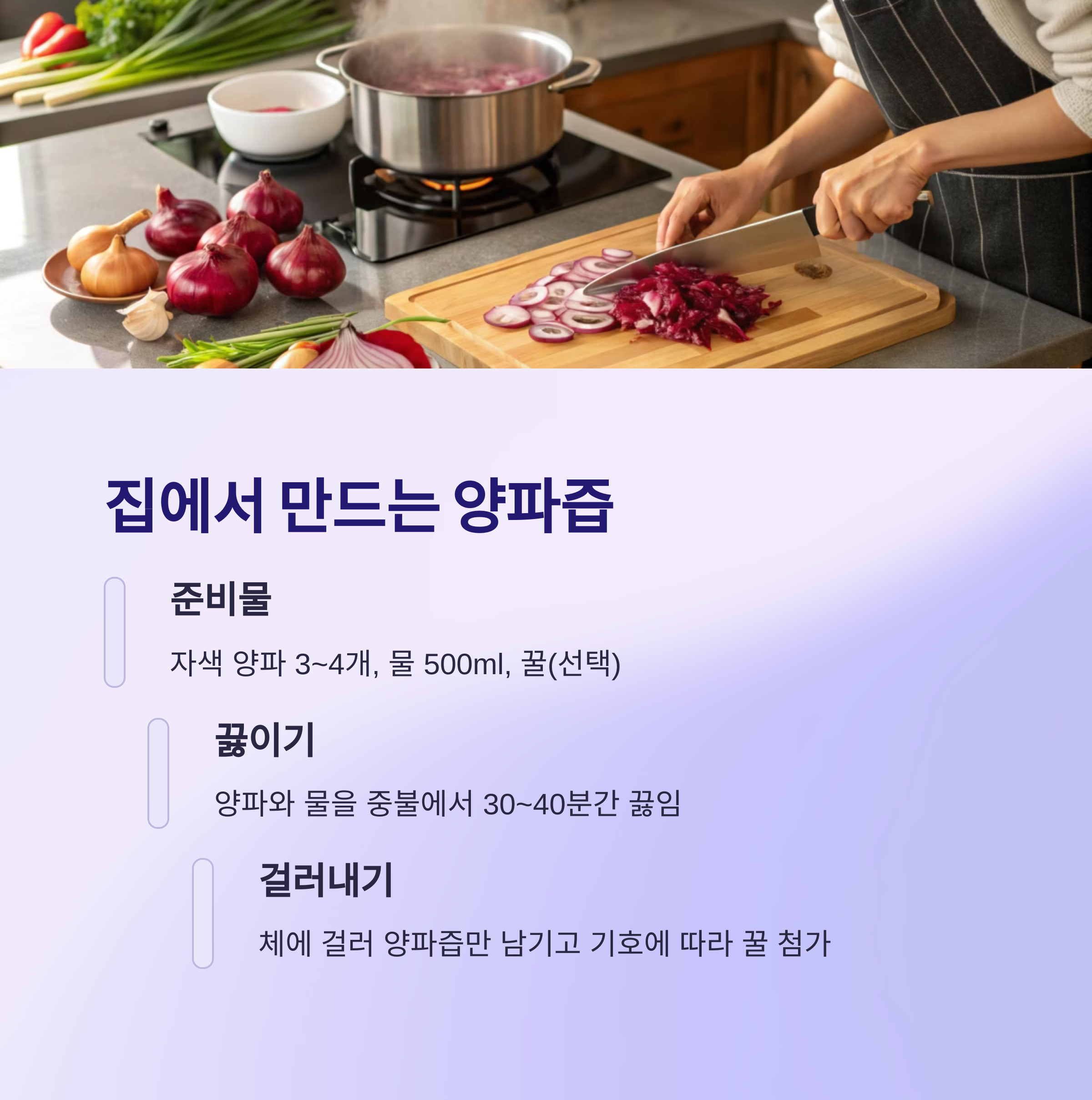 시중에서 판매되는 양파즙도 좋지만, 방부제나 첨가물을 걱정하신다면 집에서 직접 만들어보는 건 어떨까요?