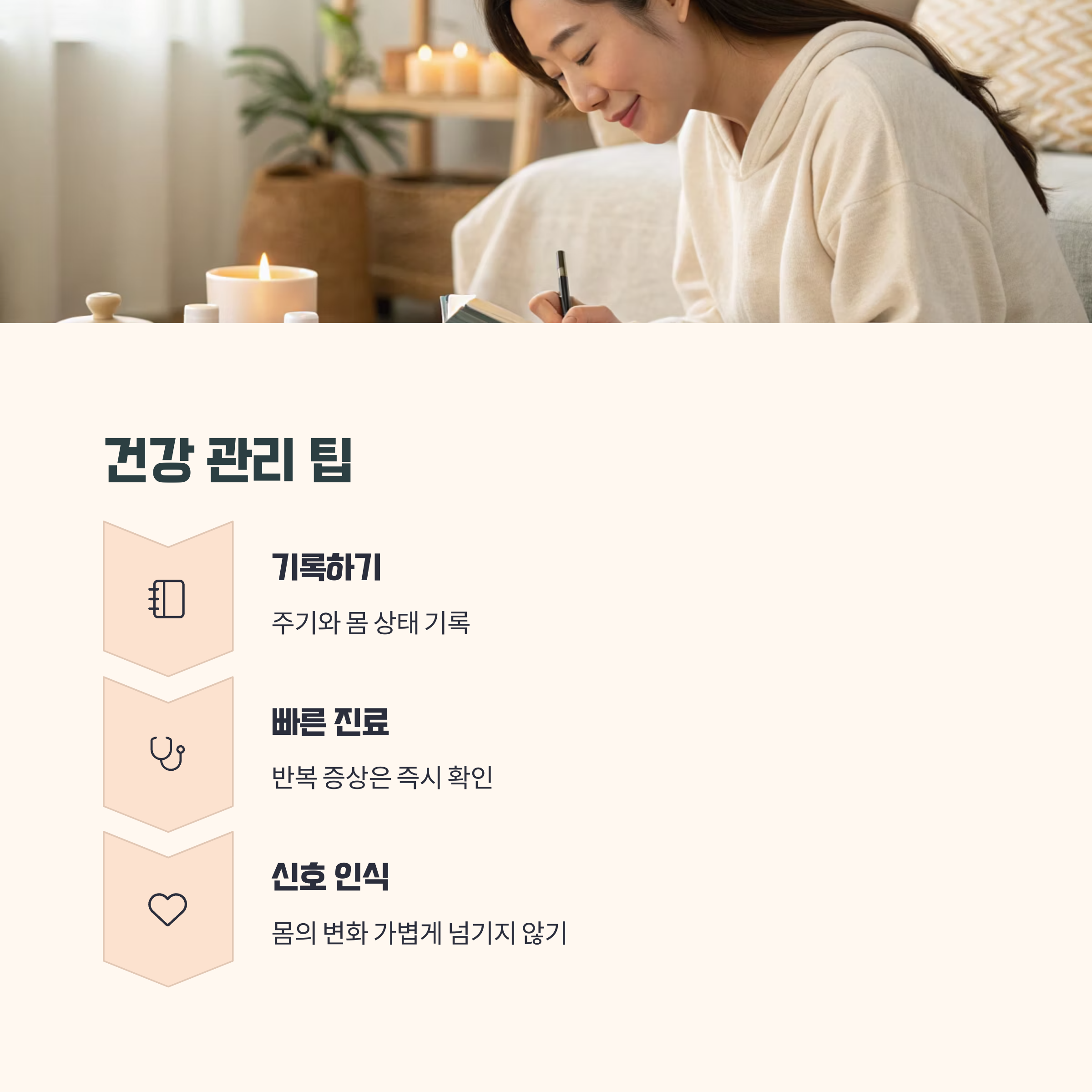 평소에 주기와 몸 상태를 잘 기록해두면 진료 시 큰 도움이 된답니다. 내 몸의 신호, 가볍게 넘기지 마세요.