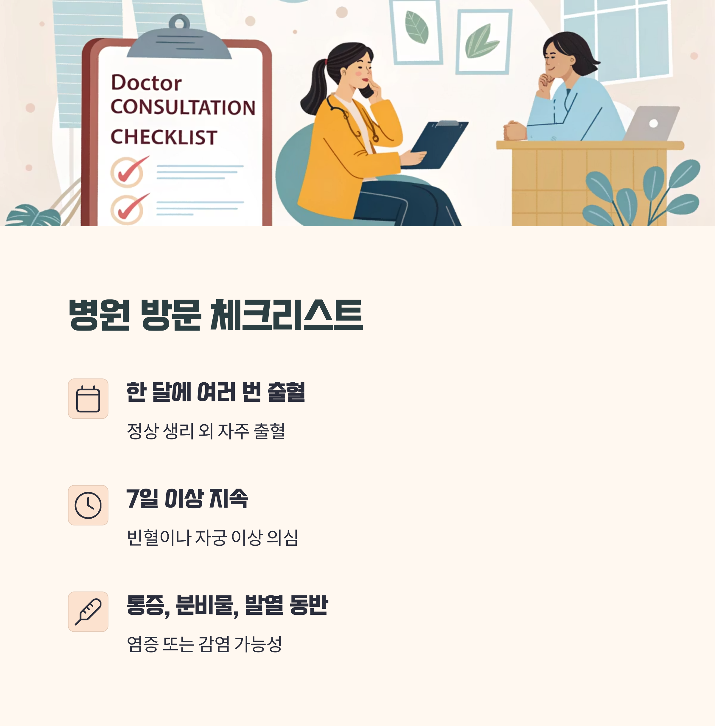출혈이 2회 이상 반복되거나 기간이 길면 반드시 병원에서 원인을 확인받는 것이 좋습니다.