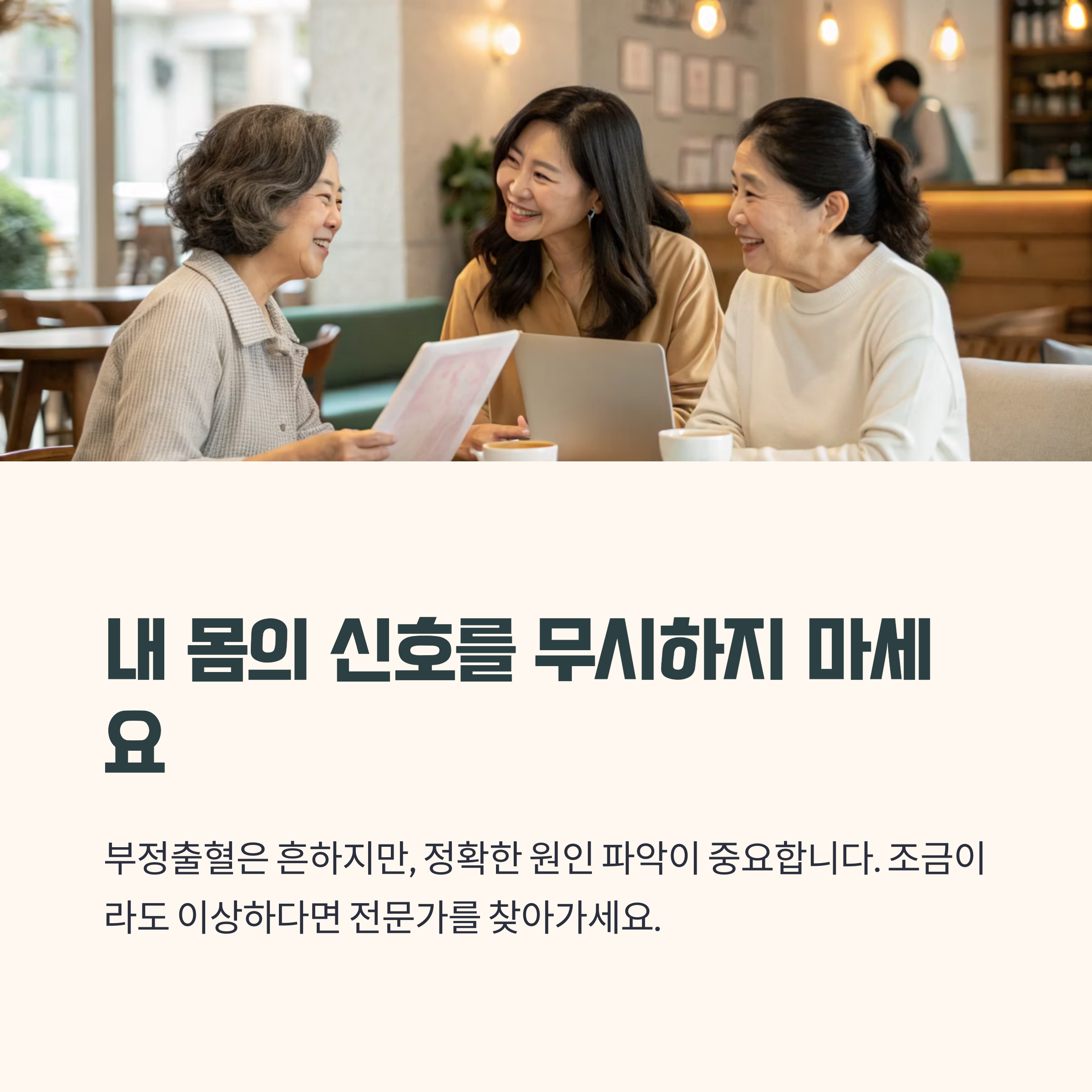 하지만 부정출혈은 비교적 흔한 현상이기도 하며, 정확한 원인을 아는 것이 무엇보다 중요합니다.