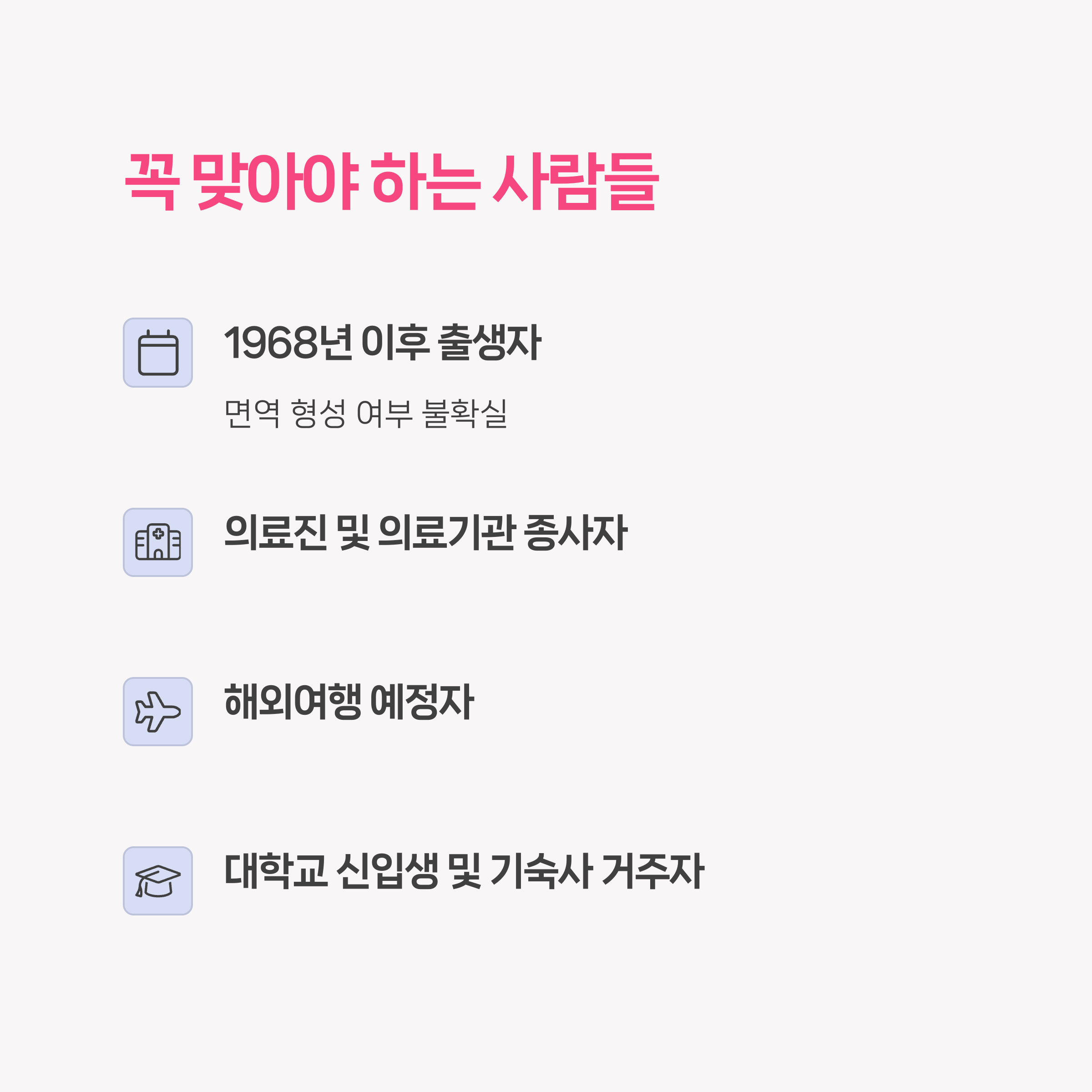 - 1968년 이후 출생자 (면역 형성 여부 불확실)
